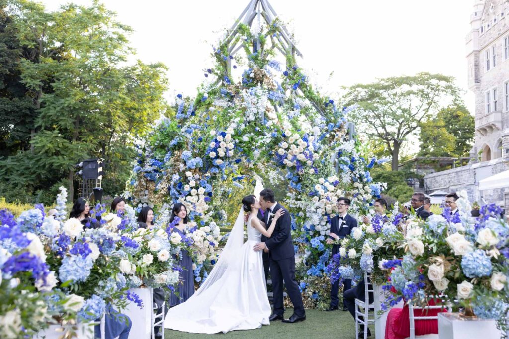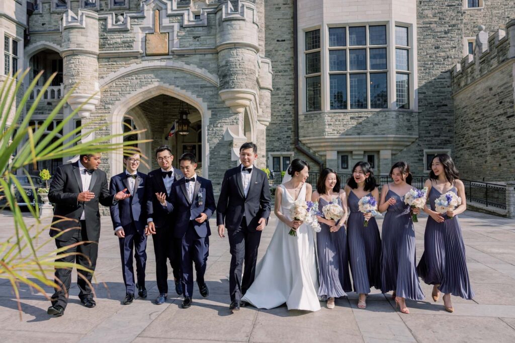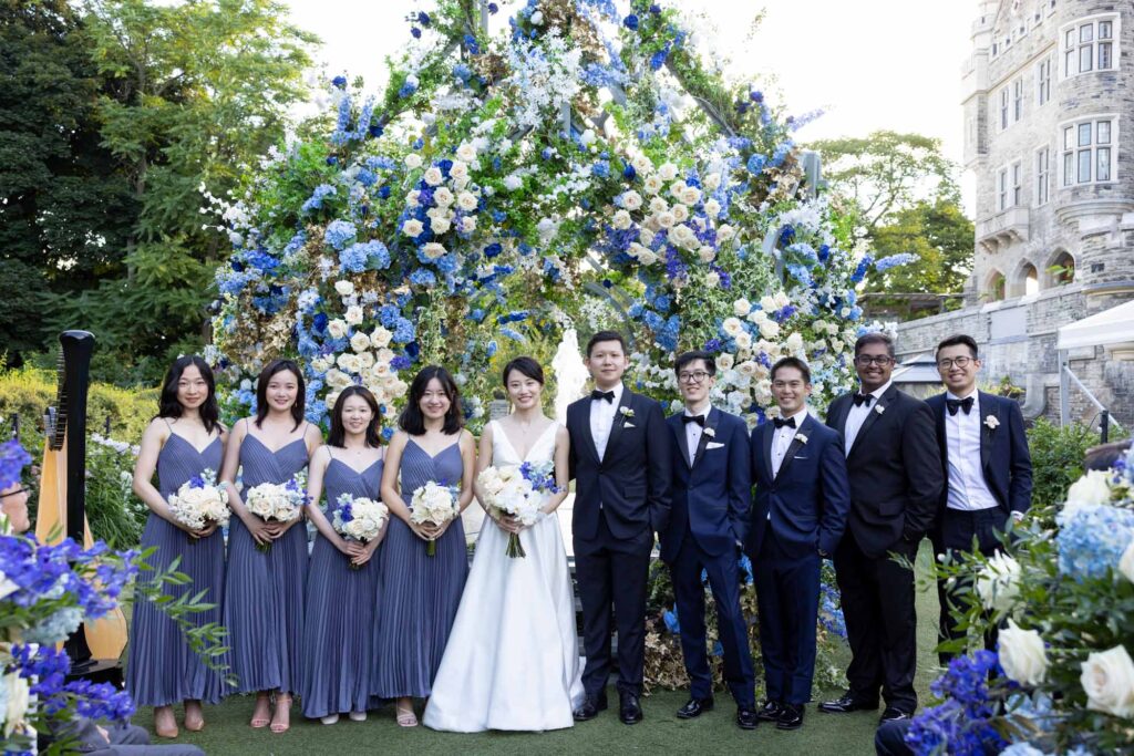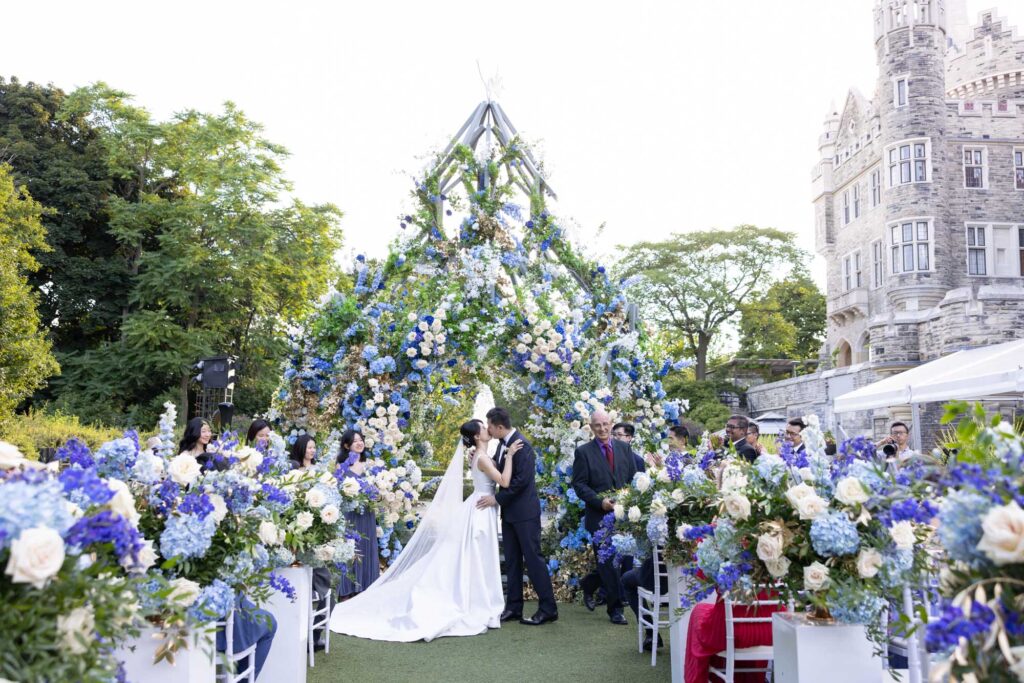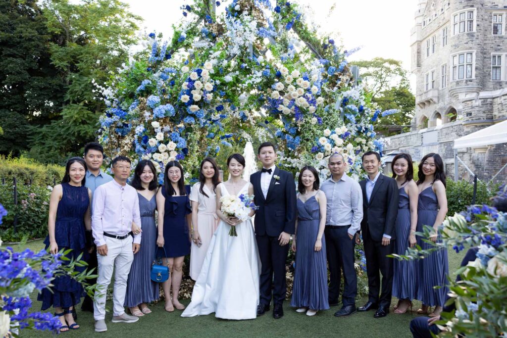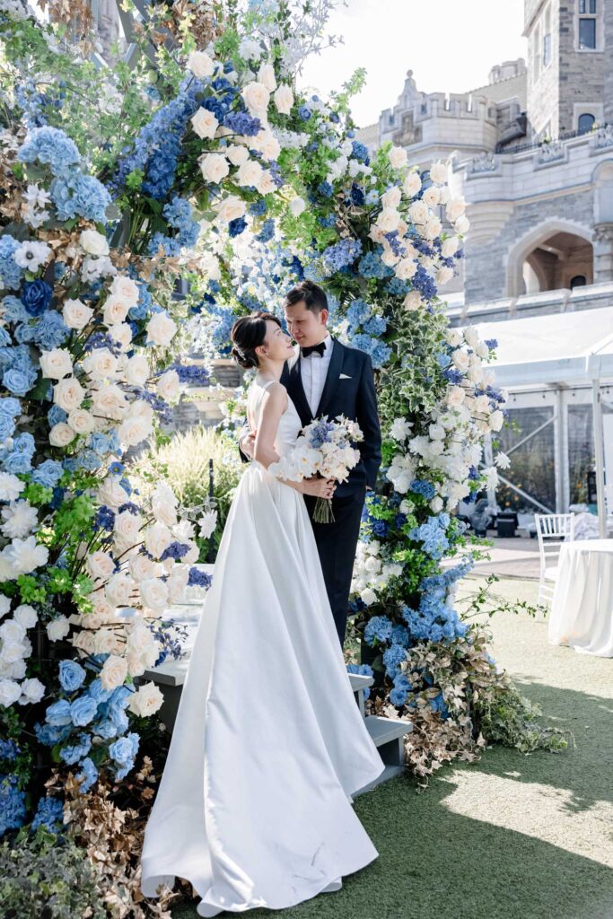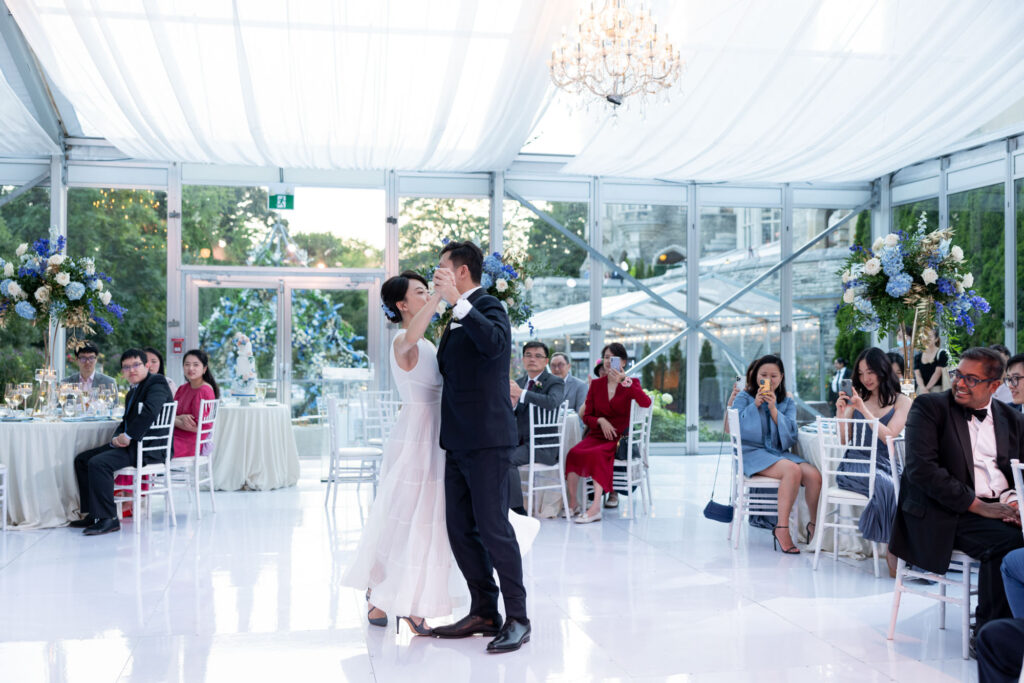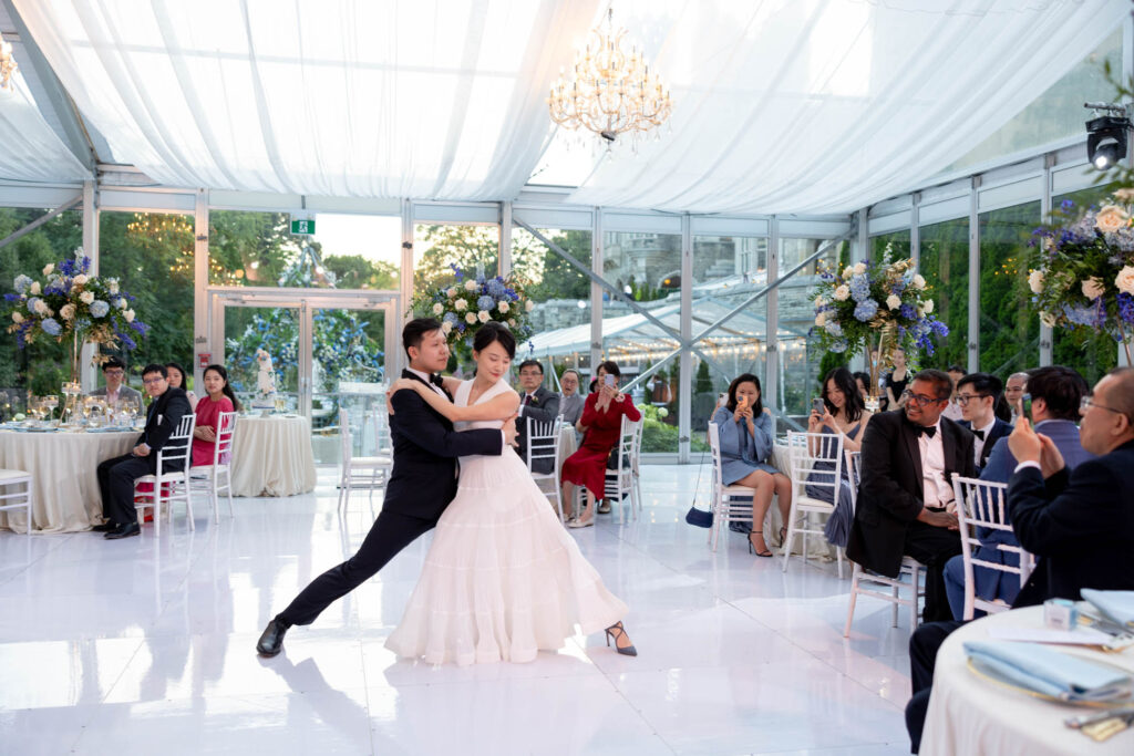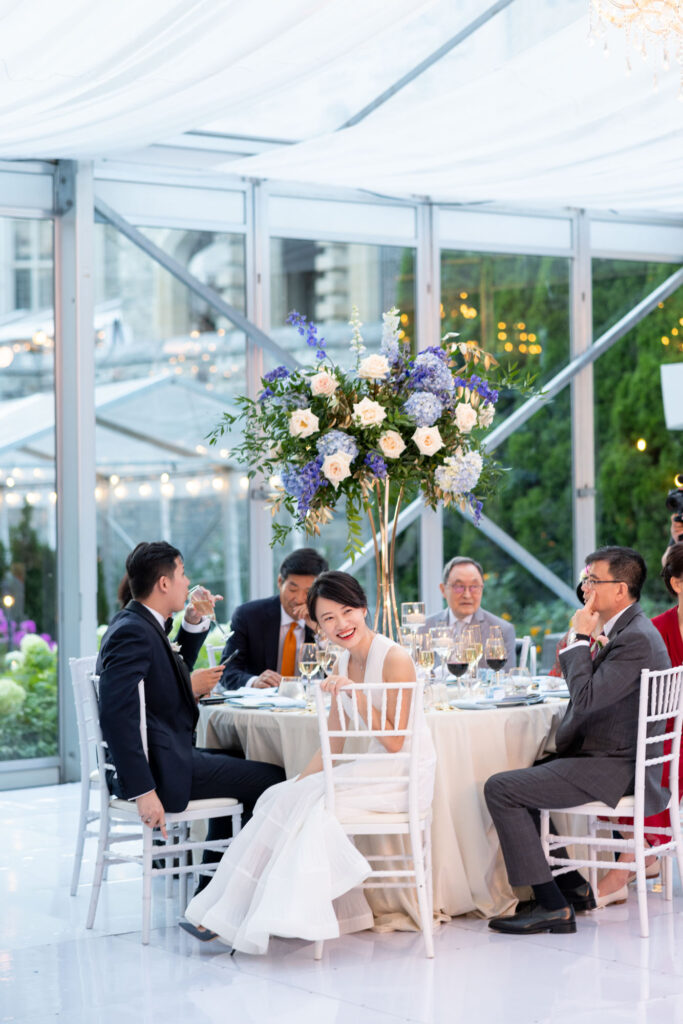 The wedding’s color palette was a dreamy combination of soft blues and purples, creating a romantic and elegant atmosphere. These colors were beautifully incorporated into the floral arrangements, table settings, and even the bridal party’s attire. The castle’s garden was transformed into a floral wonderland, with delicate blooms adding a touch of natural beauty to the historic venue. Casa Loma, with its grand architecture and lush gardens, was the perfect choice for Siyu and Alex’s wedding. The ceremony took place in the castle’s picturesque courtyard, surrounded by blooming flowers and the soft glow of natural light. As the sun set, the reception moved to a stunning transparent tent in the castle’s backyard, where the couple and their guests enjoyed an unforgettable evening under the stars. As night fell, the tent was illuminated by the warm glow of candlelight, creating a magical and intimate atmosphere. The reception was filled with heartfelt speeches from loved ones, each one bringing tears of joy and laughter. The combination of twinkling lights, soft music, and the castle’s historic charm made for a truly enchanting evening.