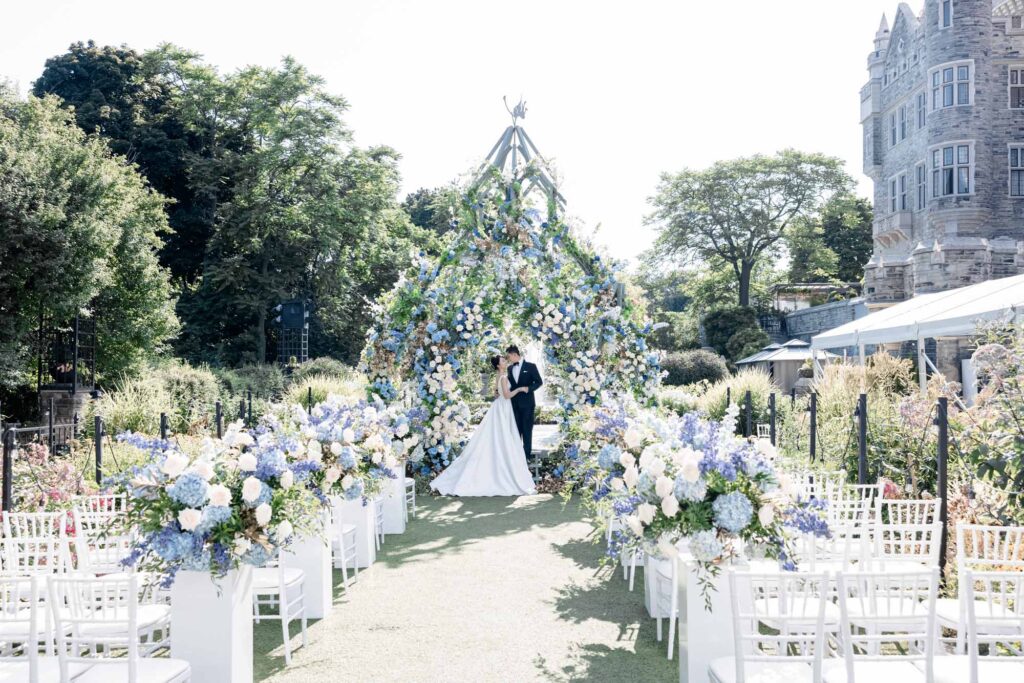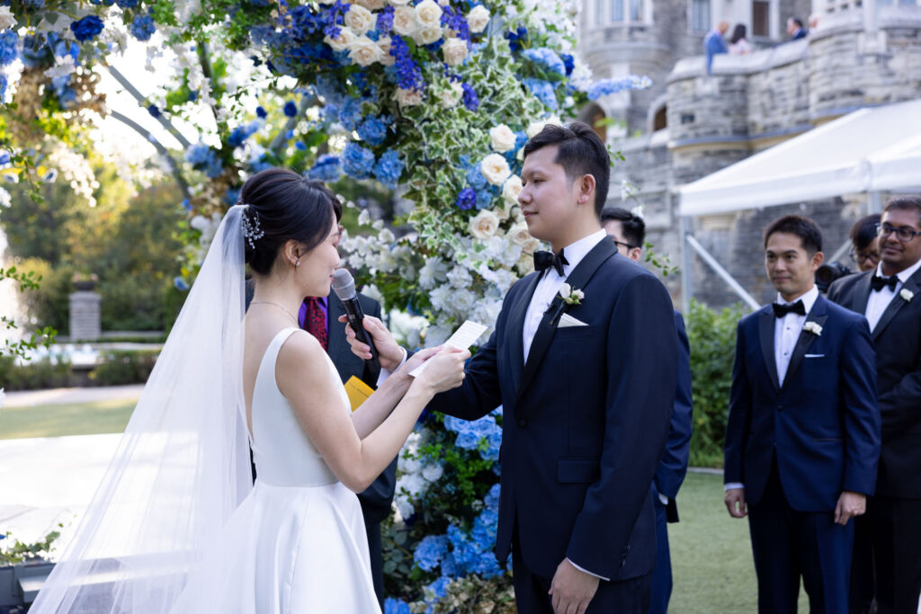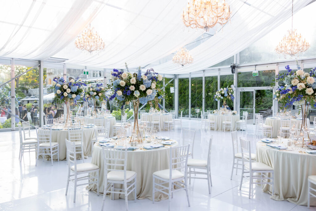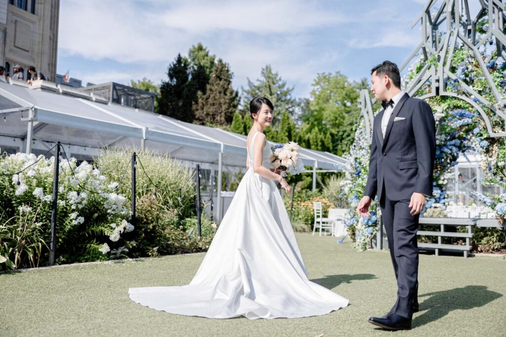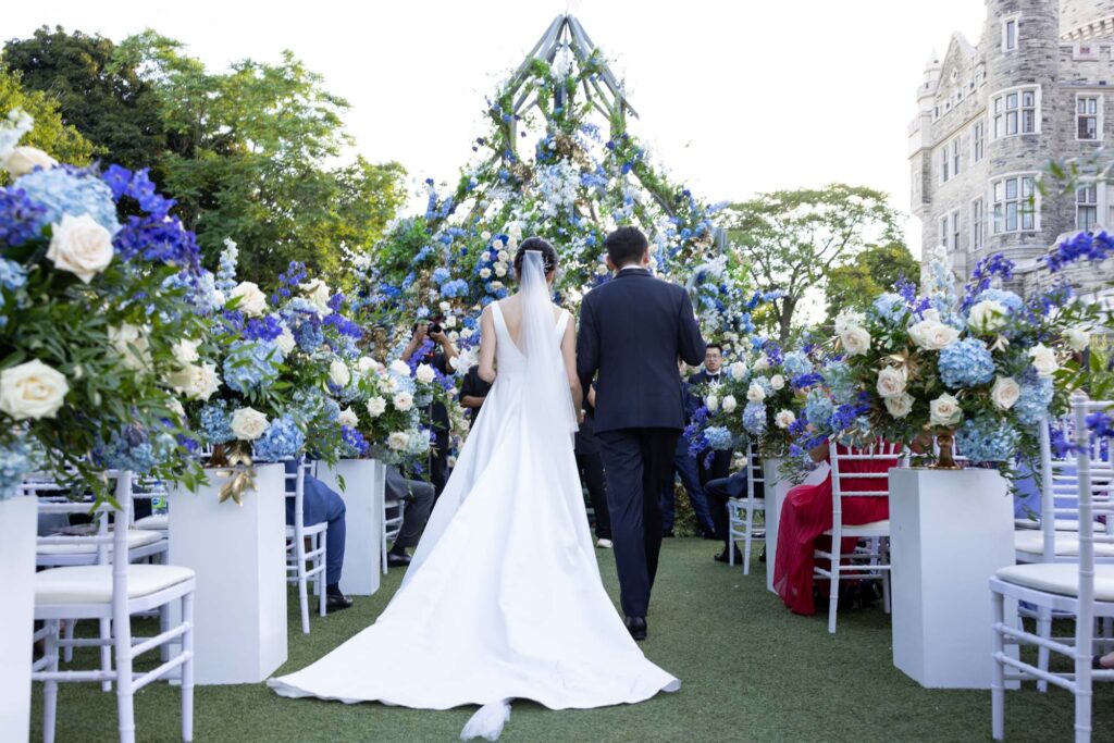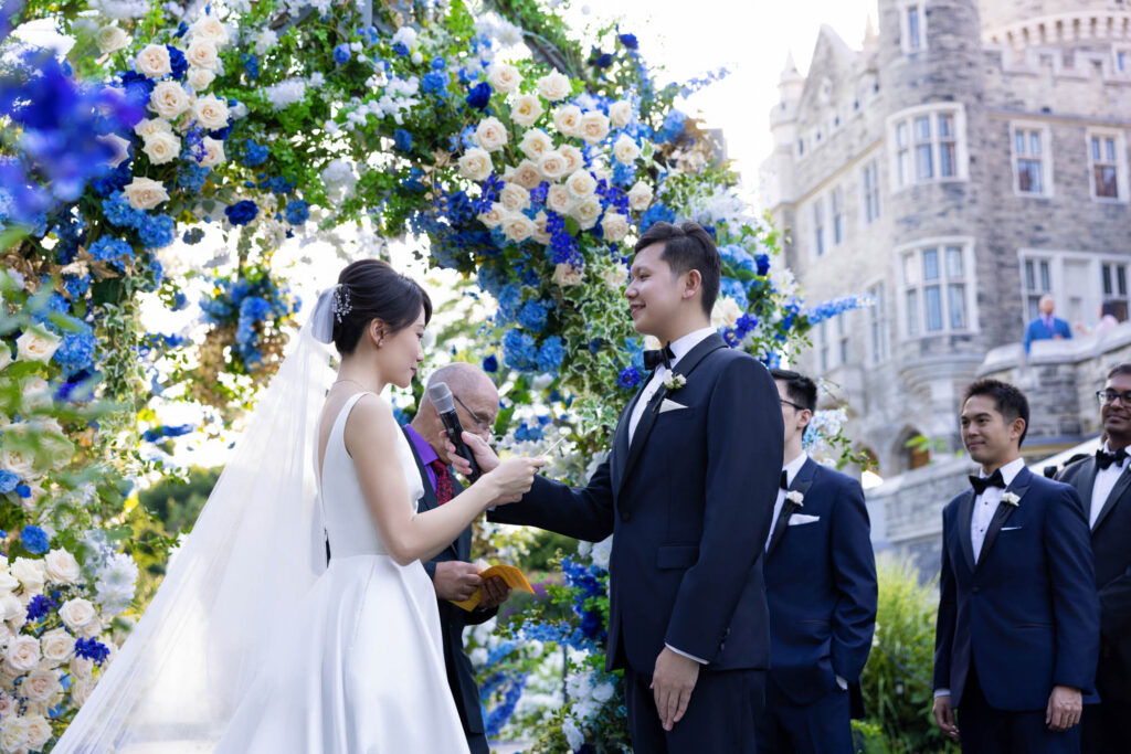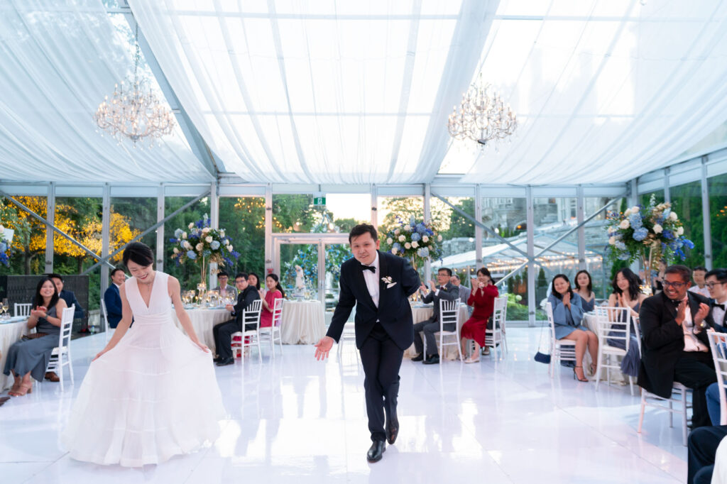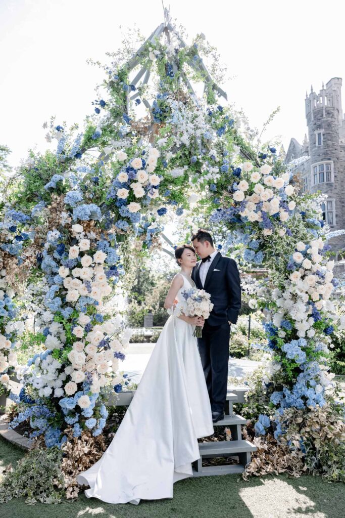 The wedding’s color palette was a dreamy combination of soft blues and purples, creating a romantic and elegant atmosphere. These colors were beautifully incorporated into the floral arrangements, table settings, and even the bridal party’s attire. The castle’s garden was transformed into a floral wonderland, with delicate blooms adding a touch of natural beauty to the historic venue. Casa Loma, with its grand architecture and lush gardens, was the perfect choice for Siyu and Alex’s wedding. The ceremony took place in the castle’s picturesque courtyard, surrounded by blooming flowers and the soft glow of natural light. As the sun set, the reception moved to a stunning transparent tent in the castle’s backyard, where the couple and their guests enjoyed an unforgettable evening under the stars. As night fell, the tent was illuminated by the warm glow of candlelight, creating a magical and intimate atmosphere. The reception was filled with heartfelt speeches from loved ones, each one bringing tears of joy and laughter. The combination of twinkling lights, soft music, and the castle’s historic charm made for a truly enchanting evening.