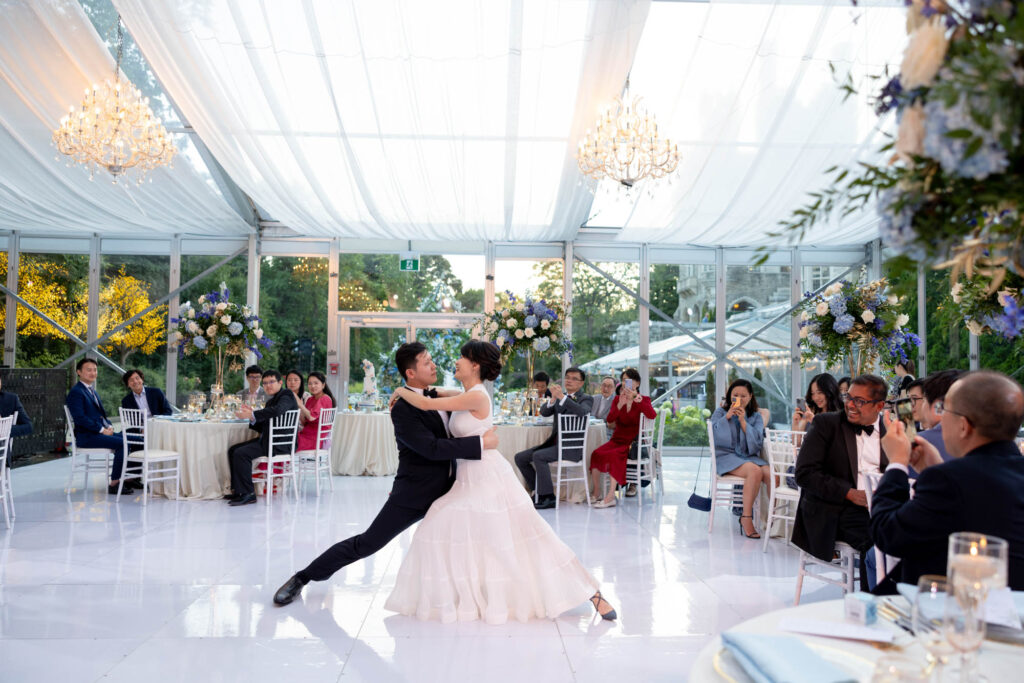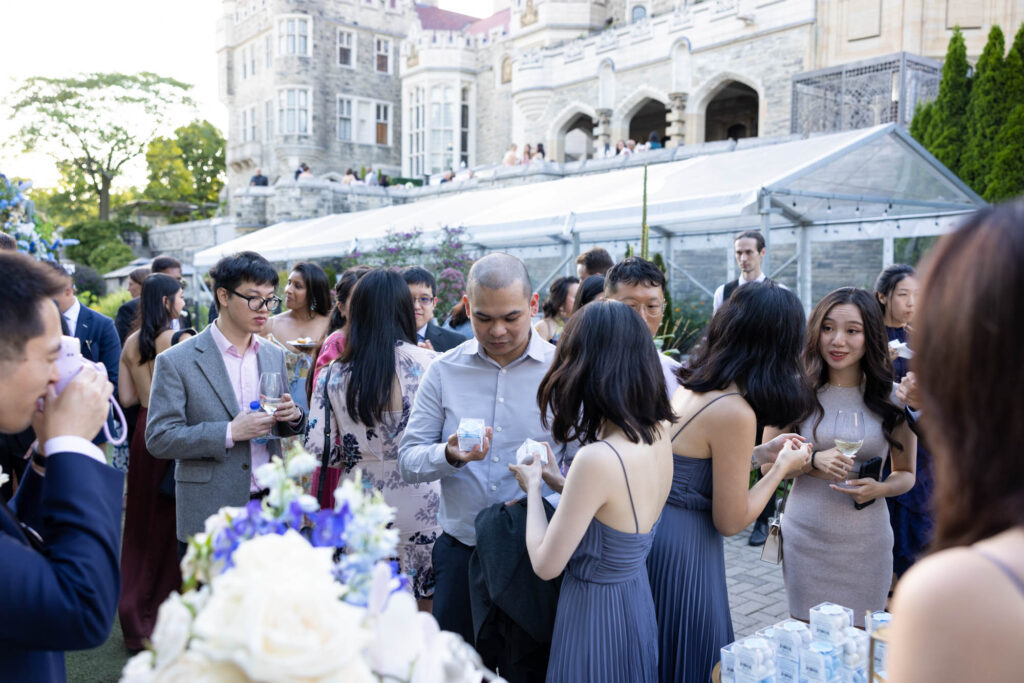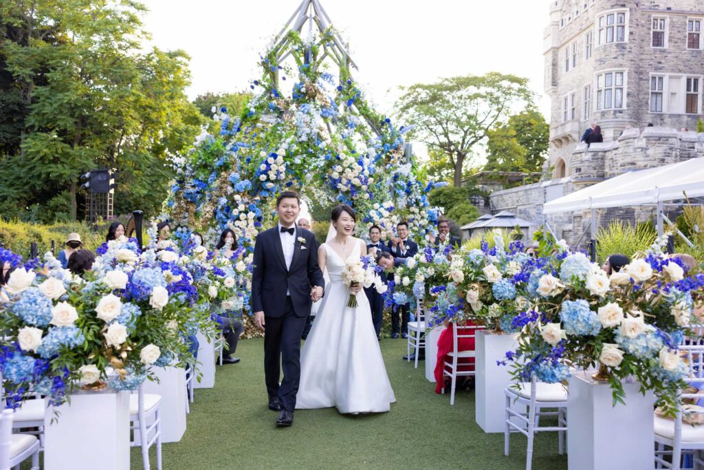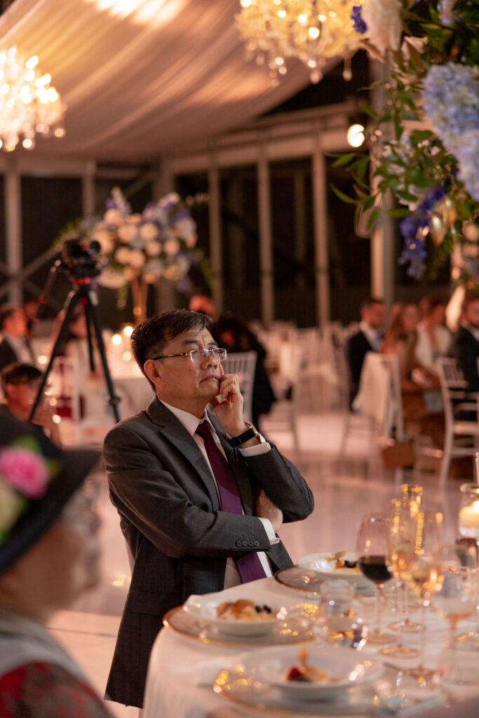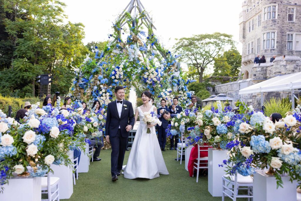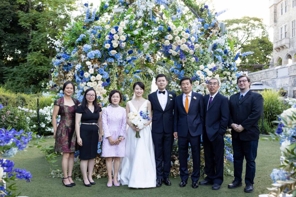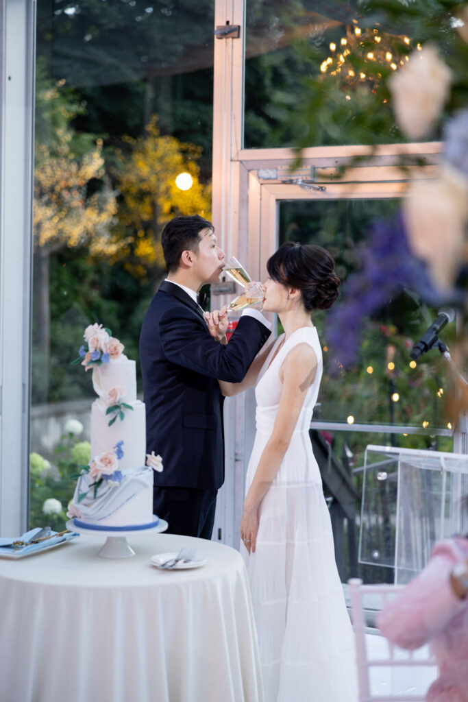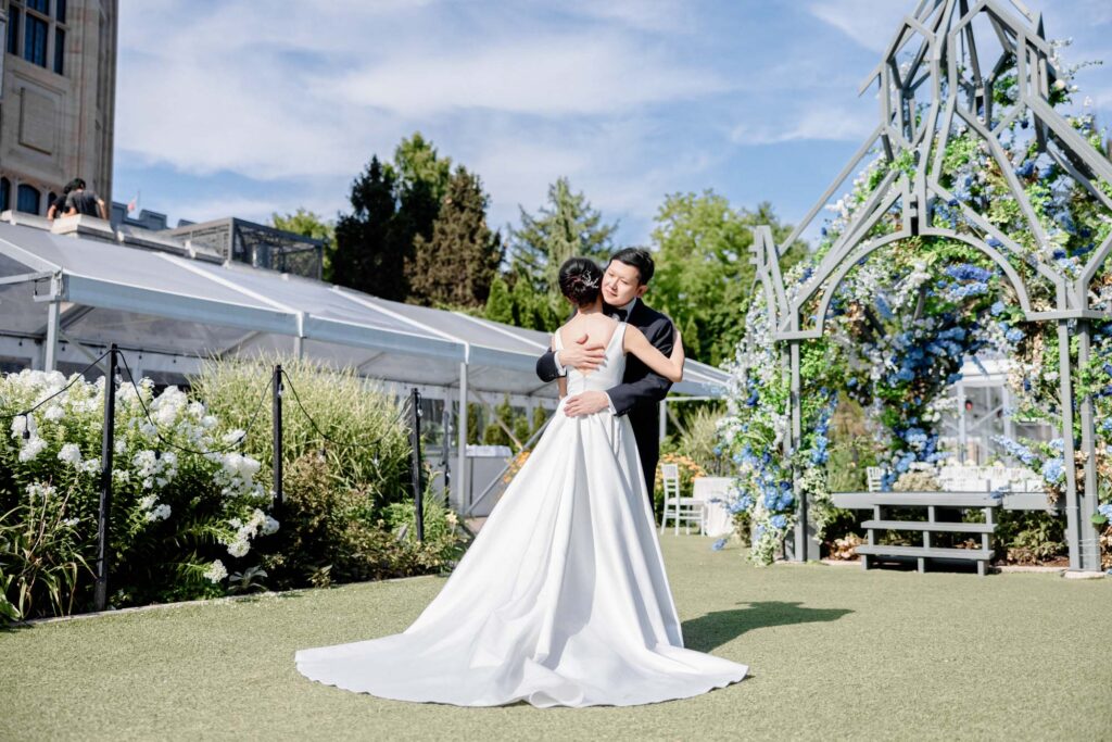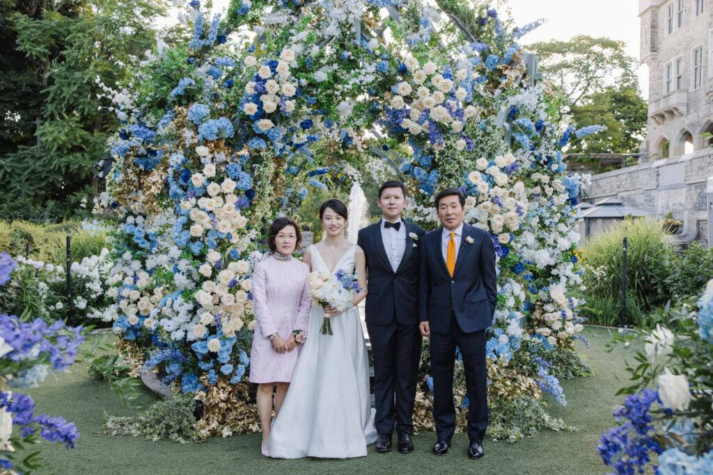 The wedding’s color palette was a dreamy combination of soft blues and purples, creating a romantic and elegant atmosphere. These colors were beautifully incorporated into the floral arrangements, table settings, and even the bridal party’s attire. The castle’s garden was transformed into a floral wonderland, with delicate blooms adding a touch of natural beauty to the historic venue. Casa Loma, with its grand architecture and lush gardens, was the perfect choice for Siyu and Alex’s wedding. The ceremony took place in the castle’s picturesque courtyard, surrounded by blooming flowers and the soft glow of natural light. As the sun set, the reception moved to a stunning transparent tent in the castle’s backyard, where the couple and their guests enjoyed an unforgettable evening under the stars. As night fell, the tent was illuminated by the warm glow of candlelight, creating a magical and intimate atmosphere. The reception was filled with heartfelt speeches from loved ones, each one bringing tears of joy and laughter. The combination of twinkling lights, soft music, and the castle’s historic charm made for a truly enchanting evening.