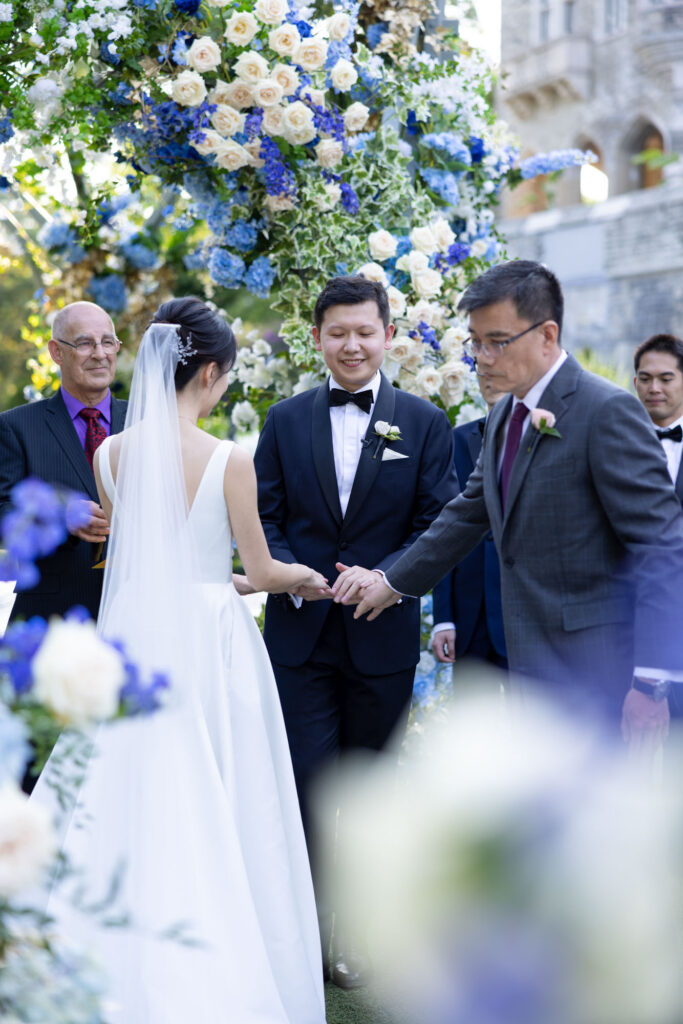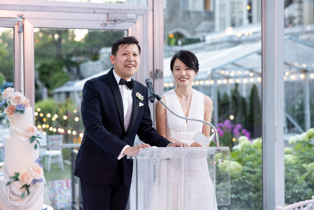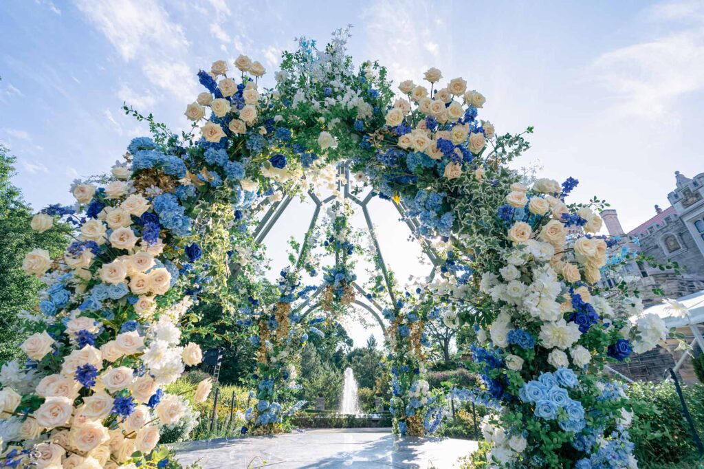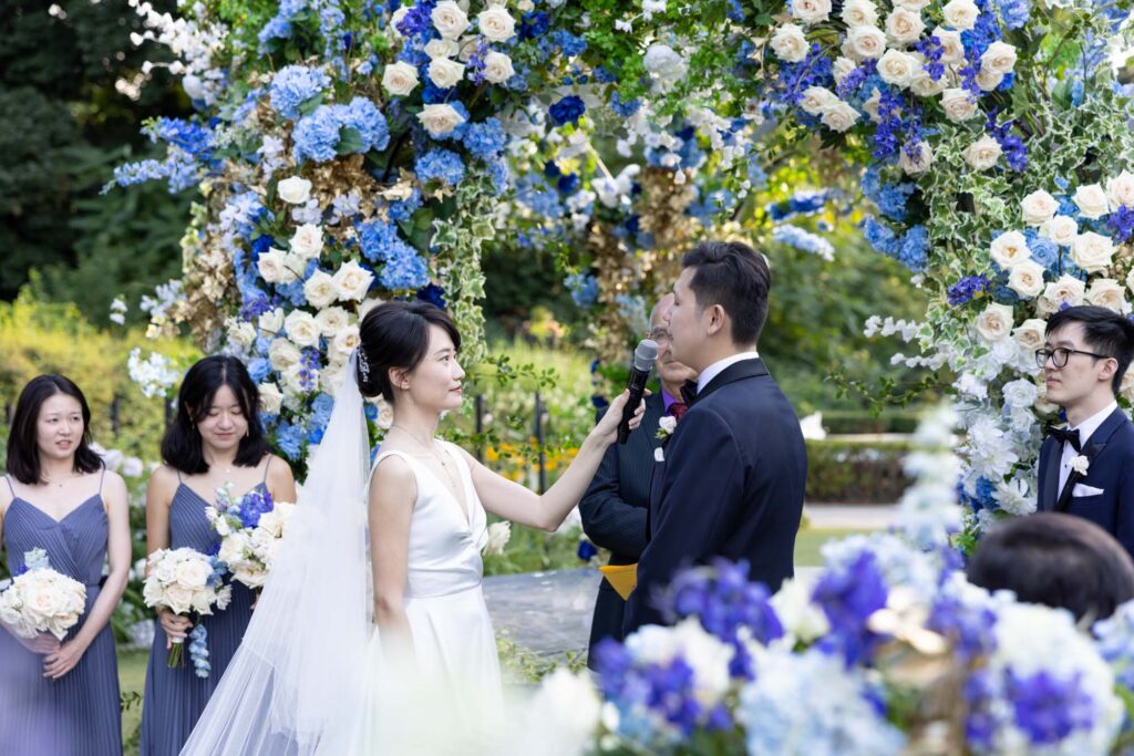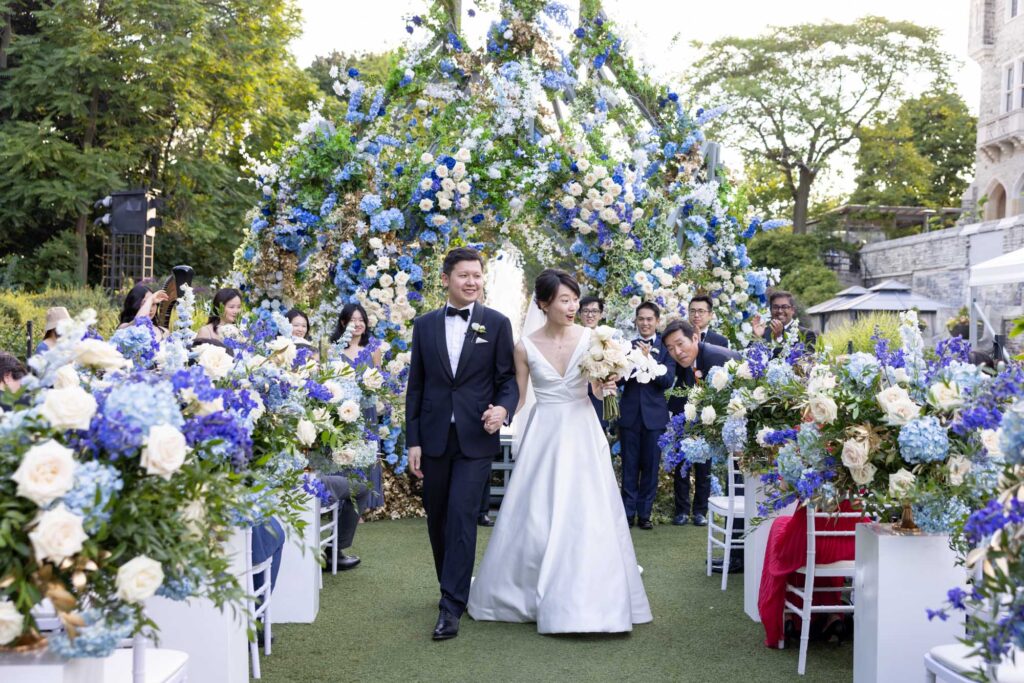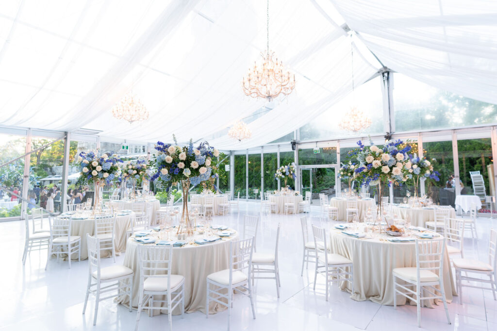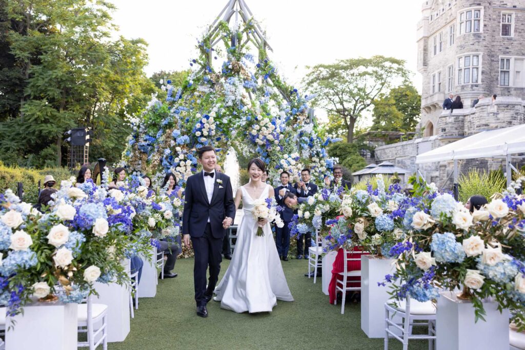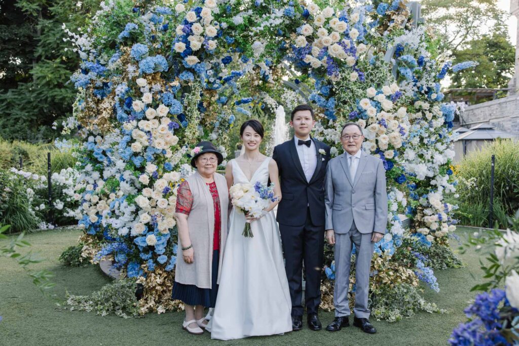 The wedding’s color palette was a dreamy combination of soft blues and purples, creating a romantic and elegant atmosphere. These colors were beautifully incorporated into the floral arrangements, table settings, and even the bridal party’s attire. The castle’s garden was transformed into a floral wonderland, with delicate blooms adding a touch of natural beauty to the historic venue. Casa Loma, with its grand architecture and lush gardens, was the perfect choice for Siyu and Alex’s wedding. The ceremony took place in the castle’s picturesque courtyard, surrounded by blooming flowers and the soft glow of natural light. As the sun set, the reception moved to a stunning transparent tent in the castle’s backyard, where the couple and their guests enjoyed an unforgettable evening under the stars. As night fell, the tent was illuminated by the warm glow of candlelight, creating a magical and intimate atmosphere. The reception was filled with heartfelt speeches from loved ones, each one bringing tears of joy and laughter. The combination of twinkling lights, soft music, and the castle’s historic charm made for a truly enchanting evening.