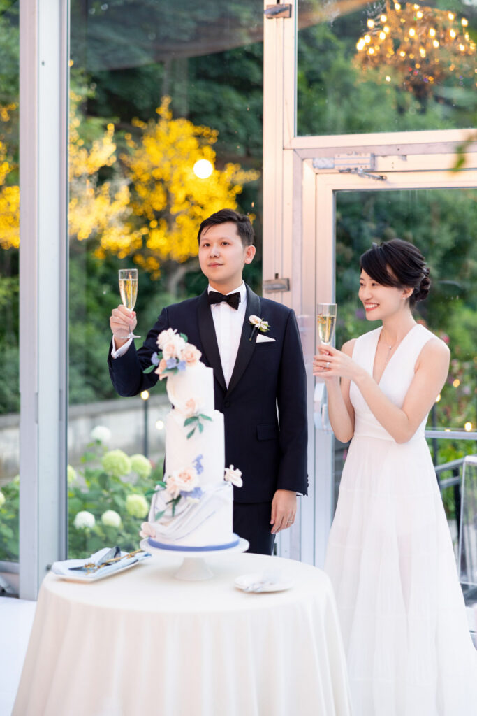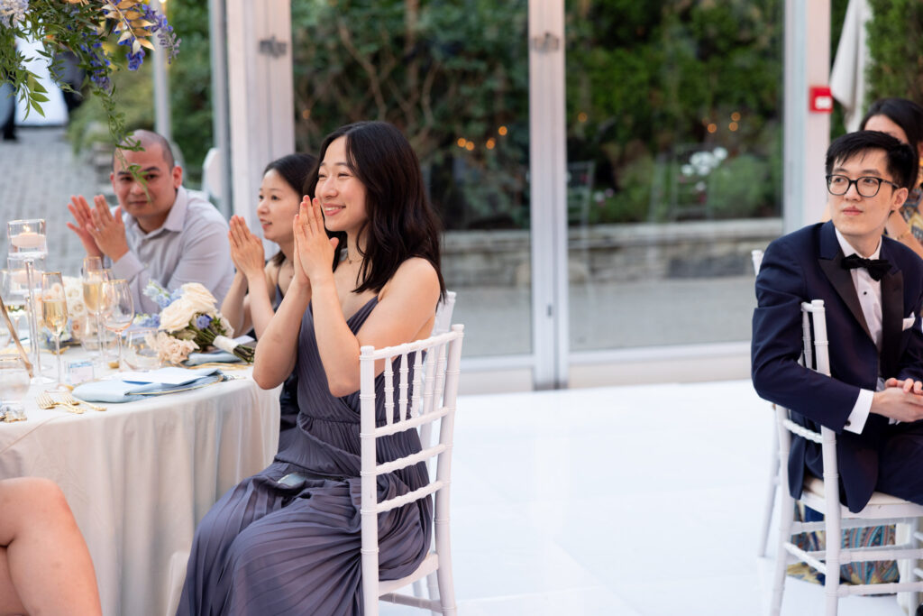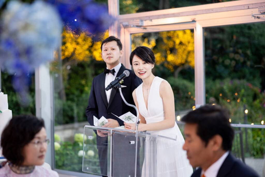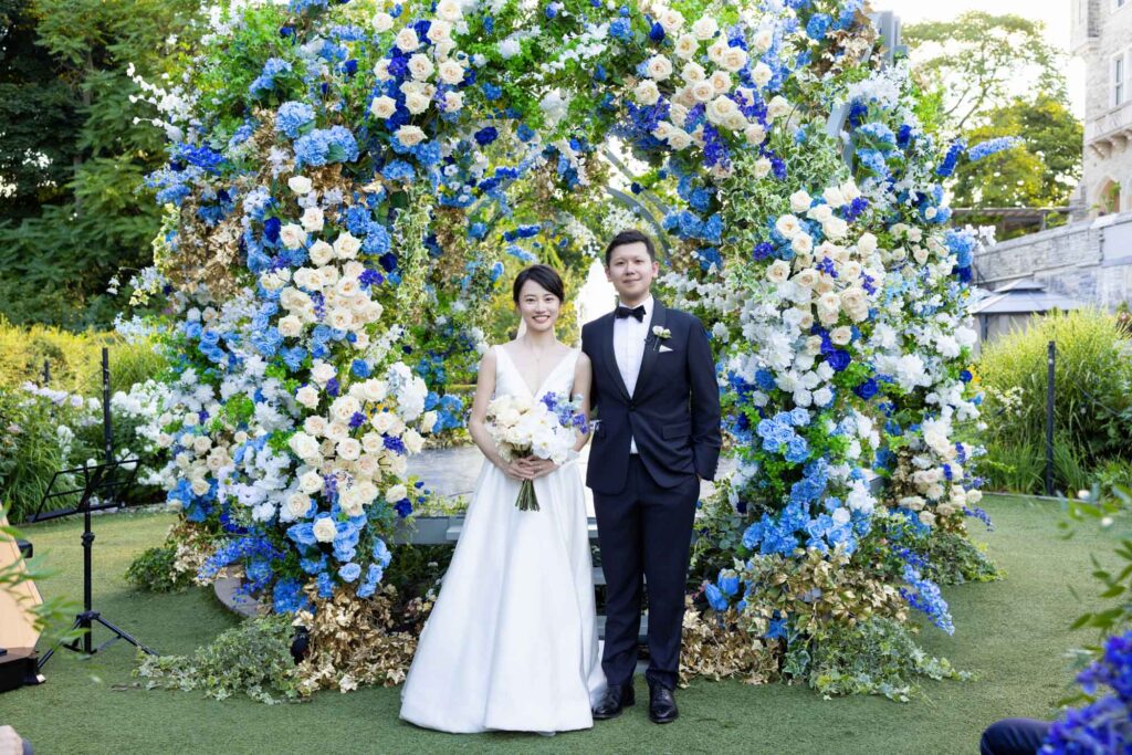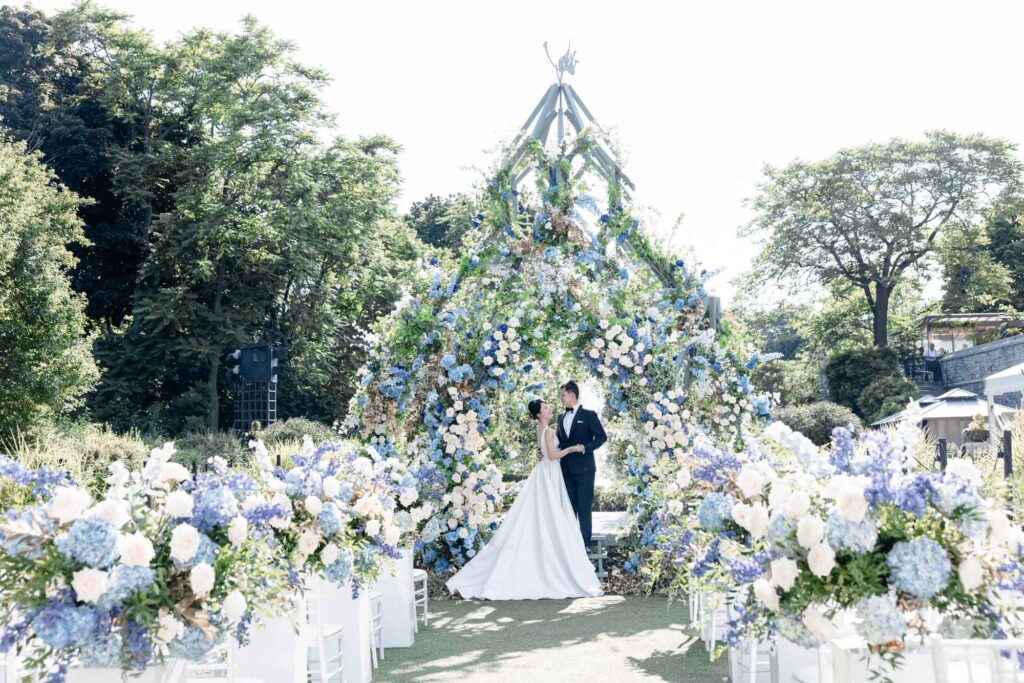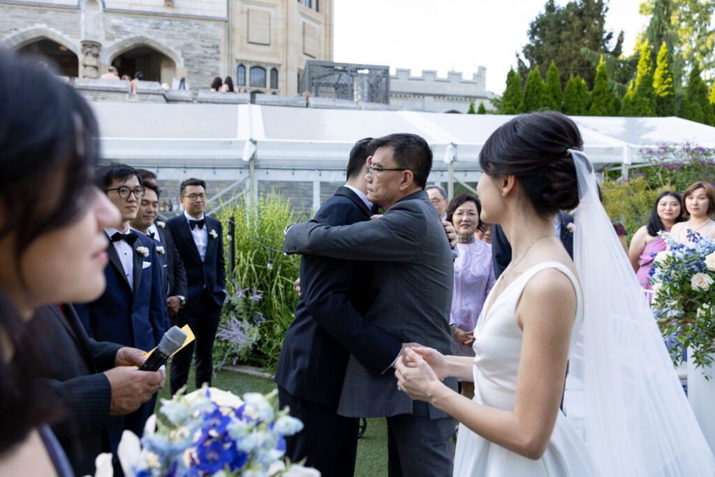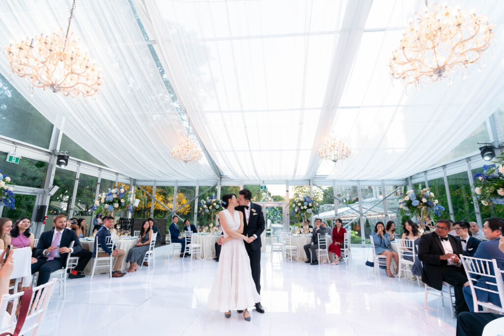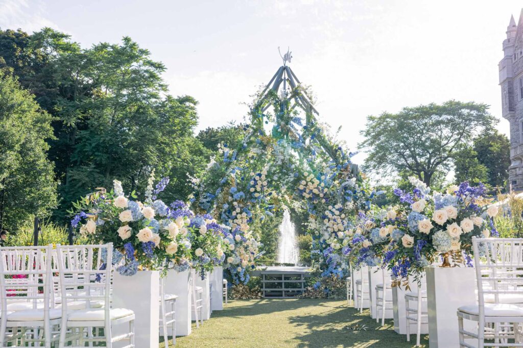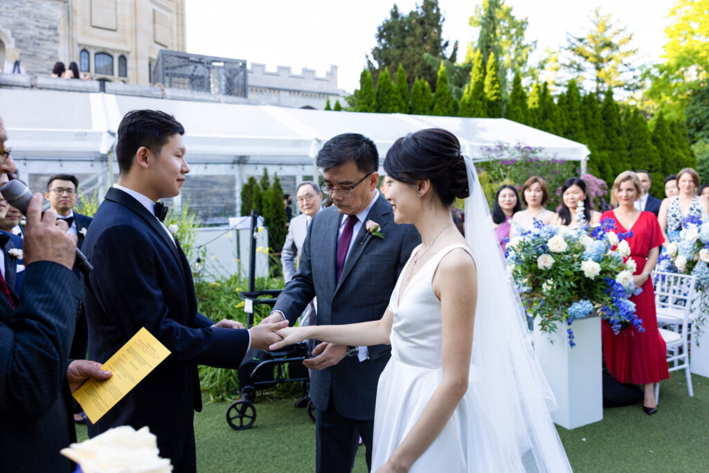 The wedding’s color palette was a dreamy combination of soft blues and purples, creating a romantic and elegant atmosphere. These colors were beautifully incorporated into the floral arrangements, table settings, and even the bridal party’s attire. The castle’s garden was transformed into a floral wonderland, with delicate blooms adding a touch of natural beauty to the historic venue. Casa Loma, with its grand architecture and lush gardens, was the perfect choice for Siyu and Alex’s wedding. The ceremony took place in the castle’s picturesque courtyard, surrounded by blooming flowers and the soft glow of natural light. As the sun set, the reception moved to a stunning transparent tent in the castle’s backyard, where the couple and their guests enjoyed an unforgettable evening under the stars. As night fell, the tent was illuminated by the warm glow of candlelight, creating a magical and intimate atmosphere. The reception was filled with heartfelt speeches from loved ones, each one bringing tears of joy and laughter. The combination of twinkling lights, soft music, and the castle’s historic charm made for a truly enchanting evening.