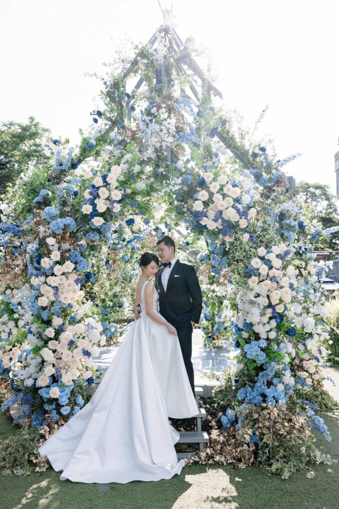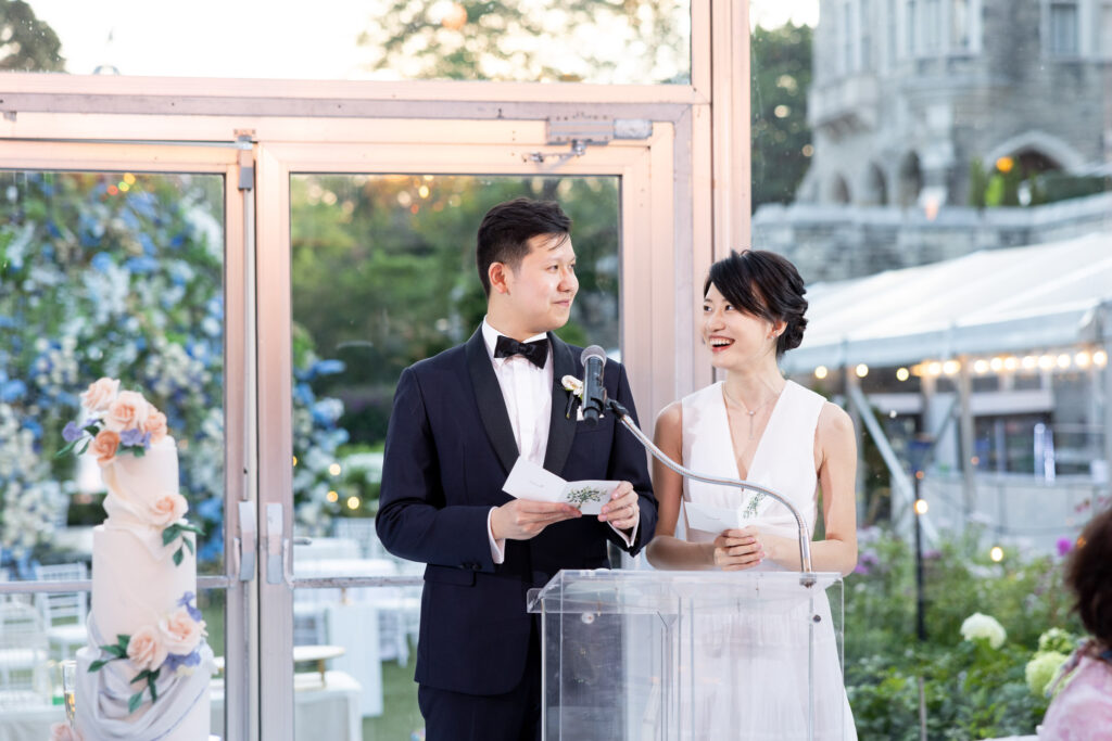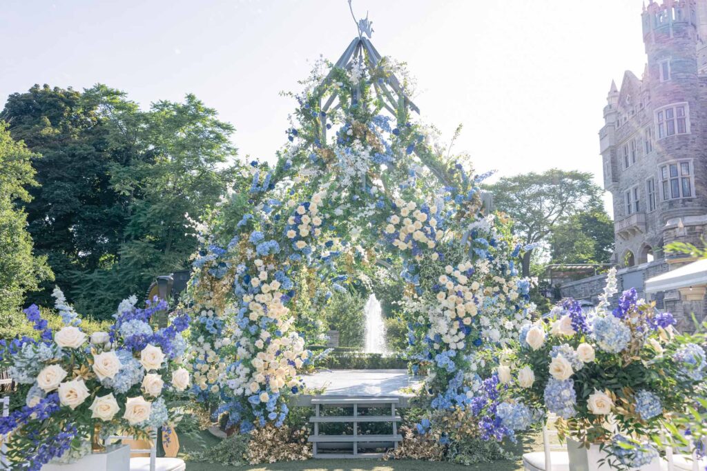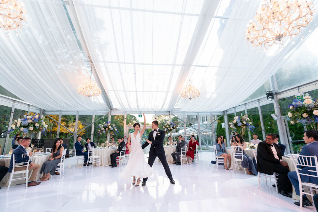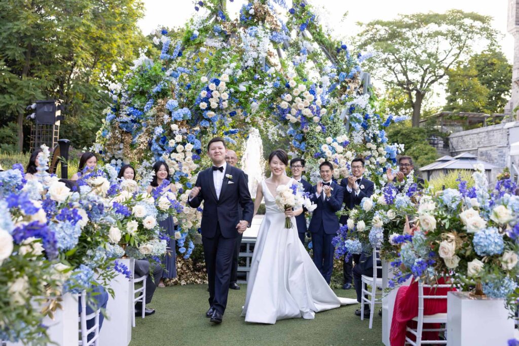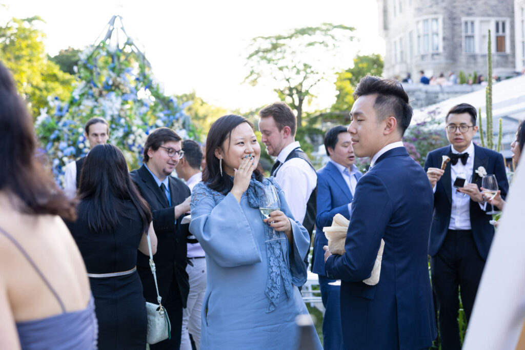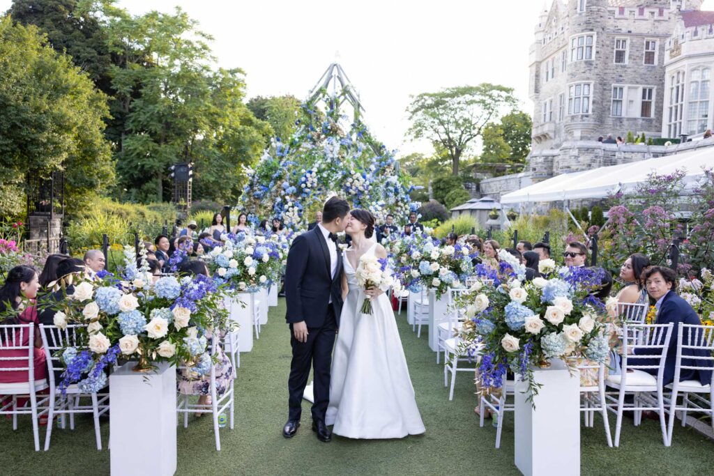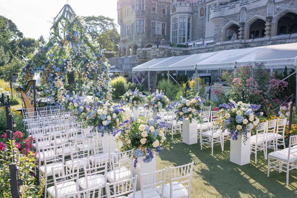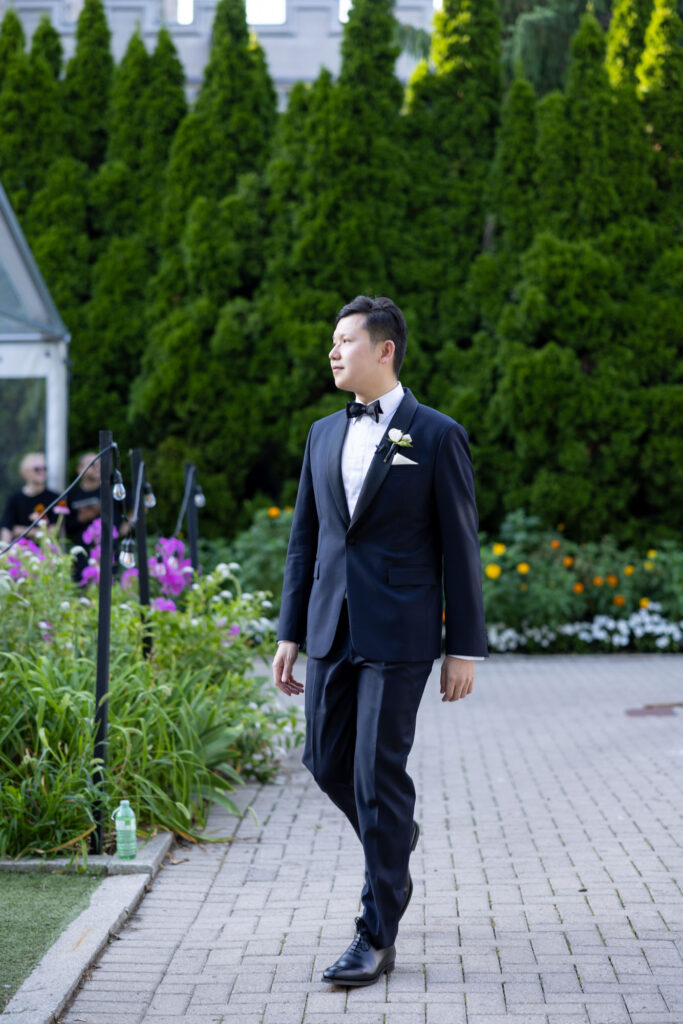 The wedding’s color palette was a dreamy combination of soft blues and purples, creating a romantic and elegant atmosphere. These colors were beautifully incorporated into the floral arrangements, table settings, and even the bridal party’s attire. The castle’s garden was transformed into a floral wonderland, with delicate blooms adding a touch of natural beauty to the historic venue. Casa Loma, with its grand architecture and lush gardens, was the perfect choice for Siyu and Alex’s wedding. The ceremony took place in the castle’s picturesque courtyard, surrounded by blooming flowers and the soft glow of natural light. As the sun set, the reception moved to a stunning transparent tent in the castle’s backyard, where the couple and their guests enjoyed an unforgettable evening under the stars. As night fell, the tent was illuminated by the warm glow of candlelight, creating a magical and intimate atmosphere. The reception was filled with heartfelt speeches from loved ones, each one bringing tears of joy and laughter. The combination of twinkling lights, soft music, and the castle’s historic charm made for a truly enchanting evening.