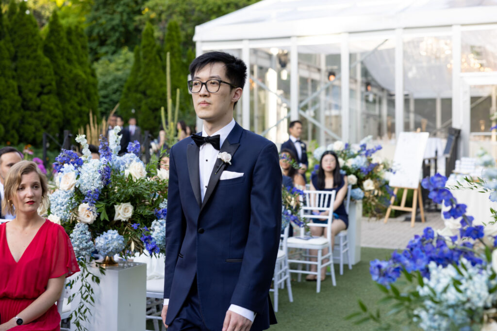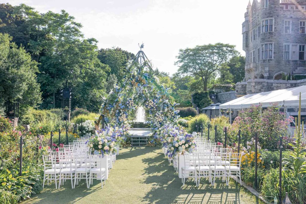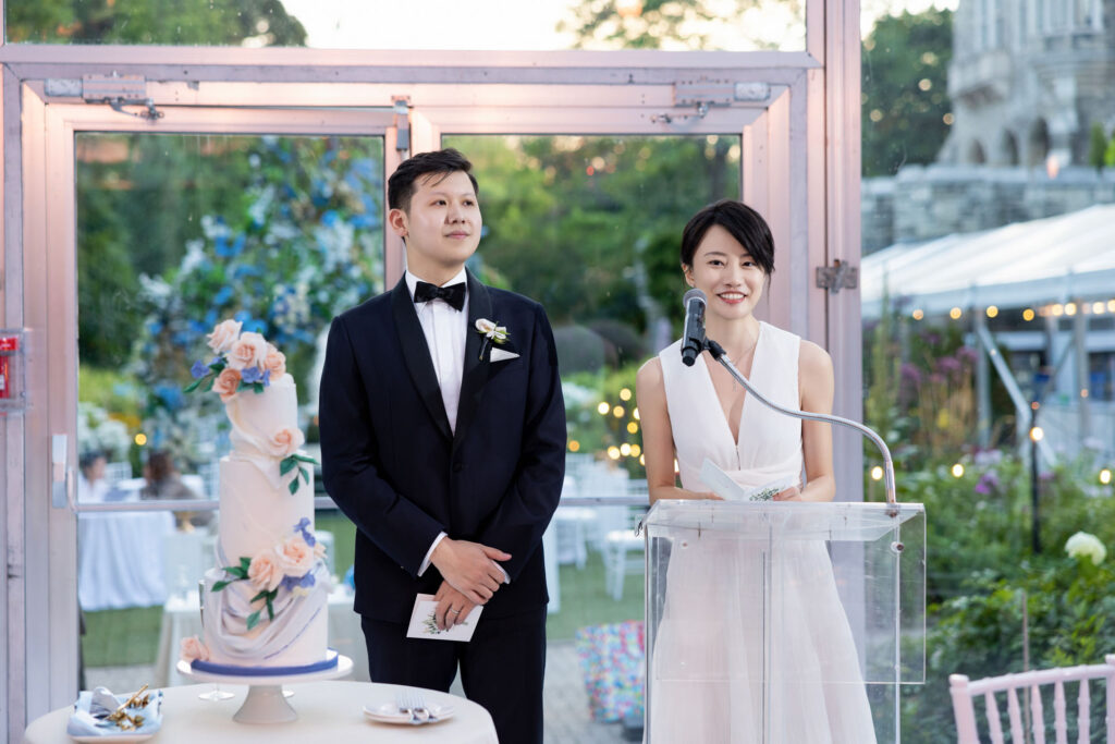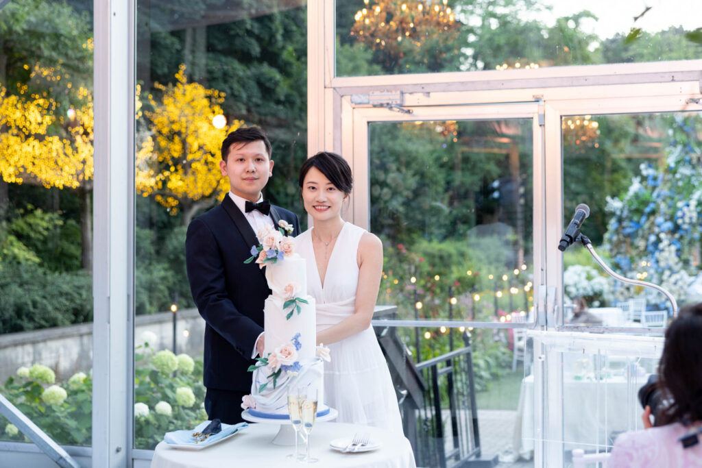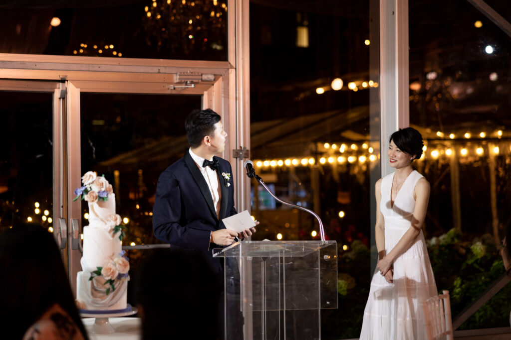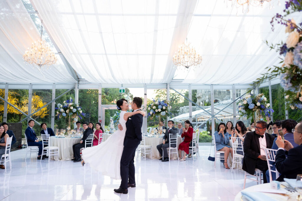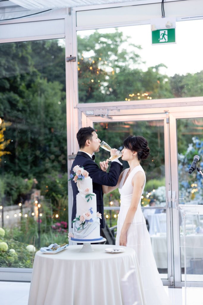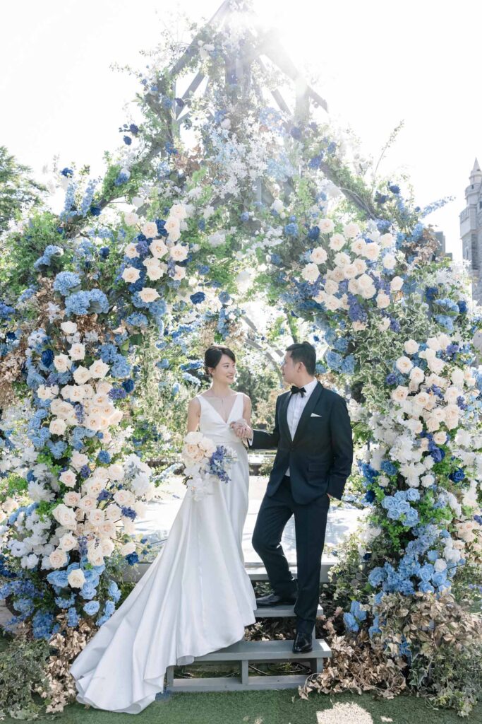 The wedding’s color palette was a dreamy combination of soft blues and purples, creating a romantic and elegant atmosphere. These colors were beautifully incorporated into the floral arrangements, table settings, and even the bridal party’s attire. The castle’s garden was transformed into a floral wonderland, with delicate blooms adding a touch of natural beauty to the historic venue. Casa Loma, with its grand architecture and lush gardens, was the perfect choice for Siyu and Alex’s wedding. The ceremony took place in the castle’s picturesque courtyard, surrounded by blooming flowers and the soft glow of natural light. As the sun set, the reception moved to a stunning transparent tent in the castle’s backyard, where the couple and their guests enjoyed an unforgettable evening under the stars. As night fell, the tent was illuminated by the warm glow of candlelight, creating a magical and intimate atmosphere. The reception was filled with heartfelt speeches from loved ones, each one bringing tears of joy and laughter. The combination of twinkling lights, soft music, and the castle’s historic charm made for a truly enchanting evening.