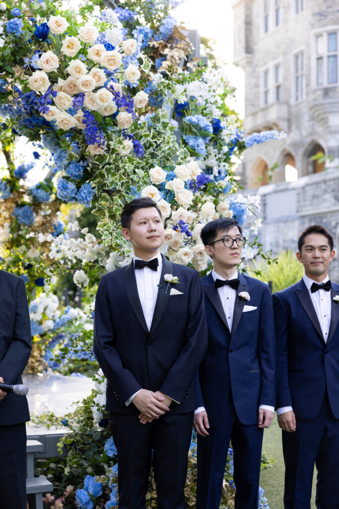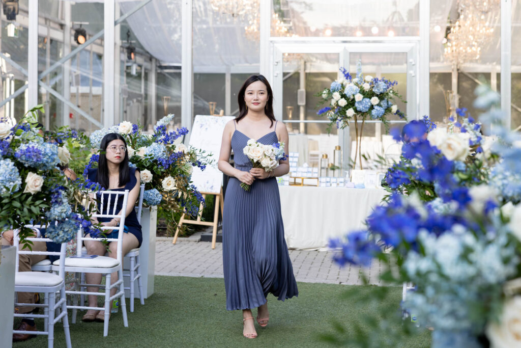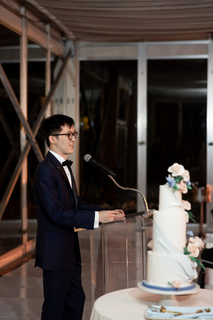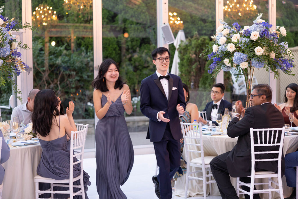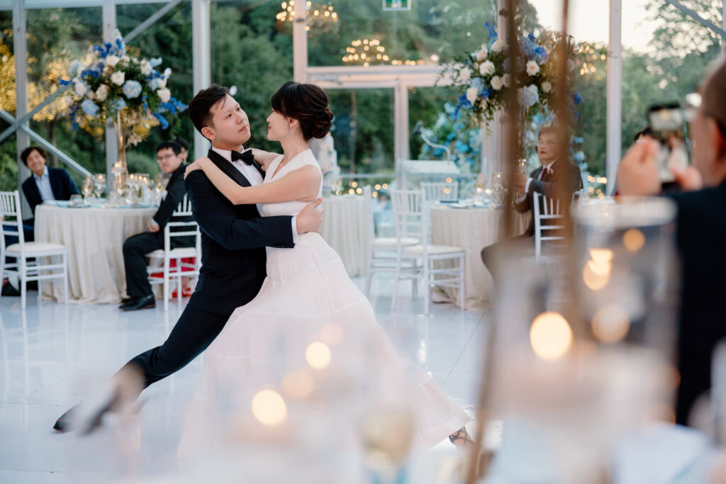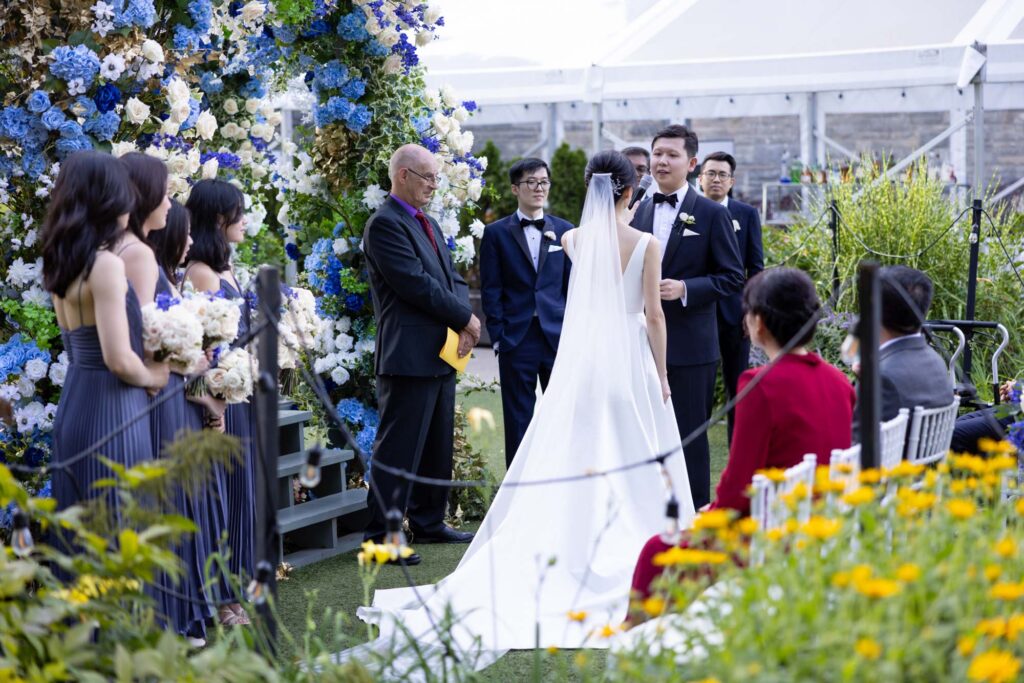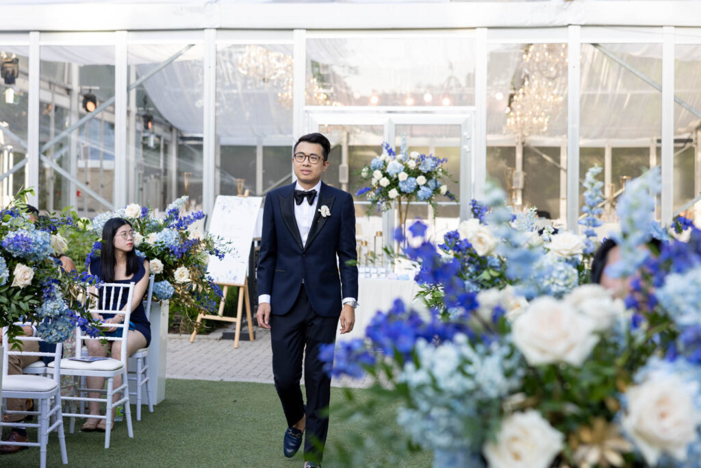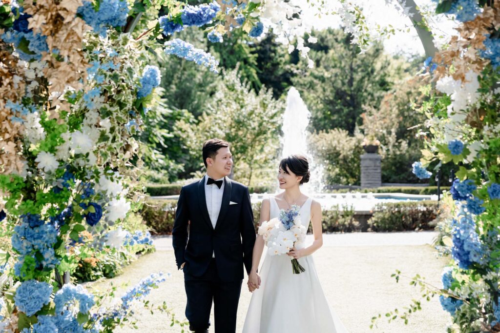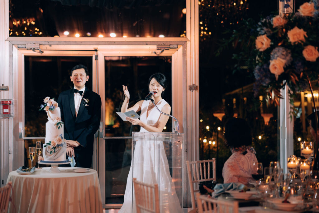 The wedding’s color palette was a dreamy combination of soft blues and purples, creating a romantic and elegant atmosphere. These colors were beautifully incorporated into the floral arrangements, table settings, and even the bridal party’s attire. The castle’s garden was transformed into a floral wonderland, with delicate blooms adding a touch of natural beauty to the historic venue. Casa Loma, with its grand architecture and lush gardens, was the perfect choice for Siyu and Alex’s wedding. The ceremony took place in the castle’s picturesque courtyard, surrounded by blooming flowers and the soft glow of natural light. As the sun set, the reception moved to a stunning transparent tent in the castle’s backyard, where the couple and their guests enjoyed an unforgettable evening under the stars. As night fell, the tent was illuminated by the warm glow of candlelight, creating a magical and intimate atmosphere. The reception was filled with heartfelt speeches from loved ones, each one bringing tears of joy and laughter. The combination of twinkling lights, soft music, and the castle’s historic charm made for a truly enchanting evening.