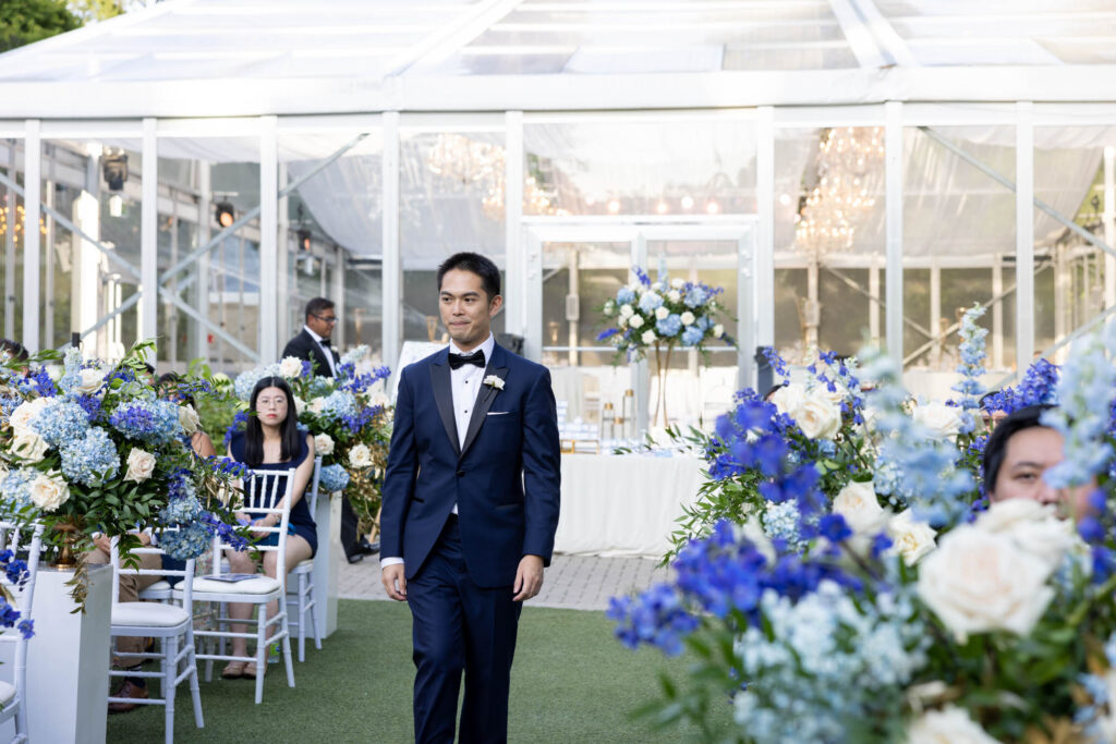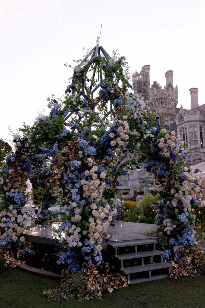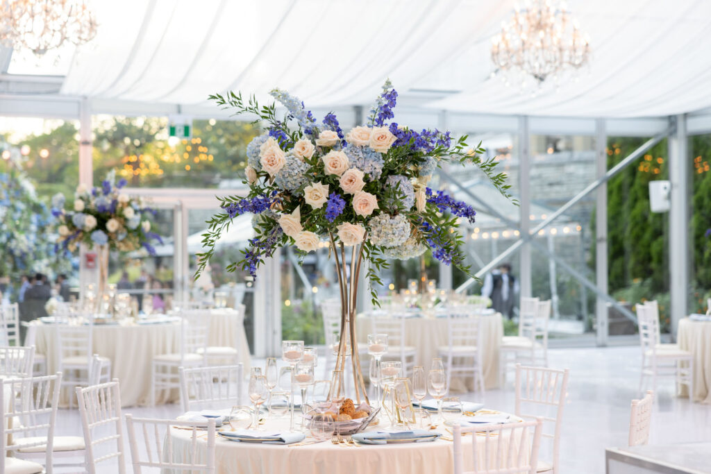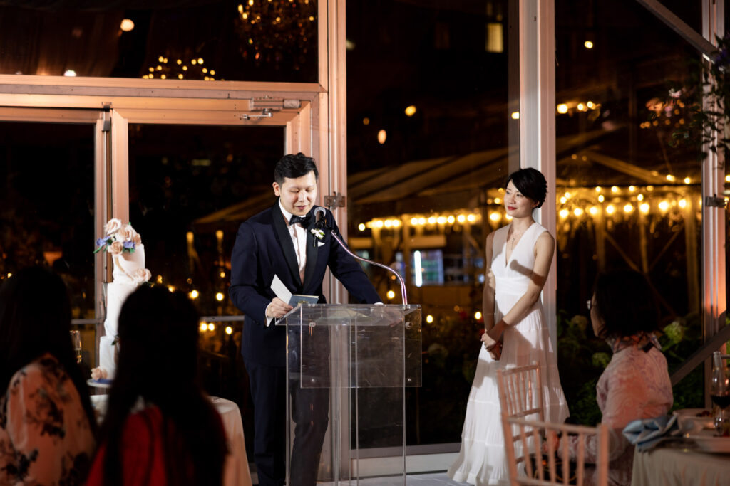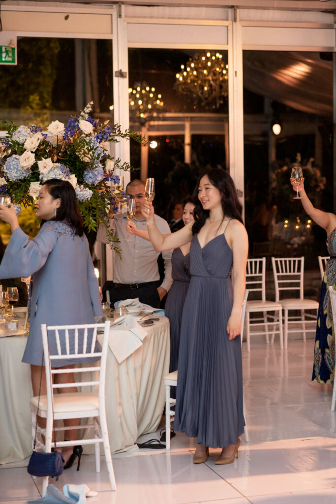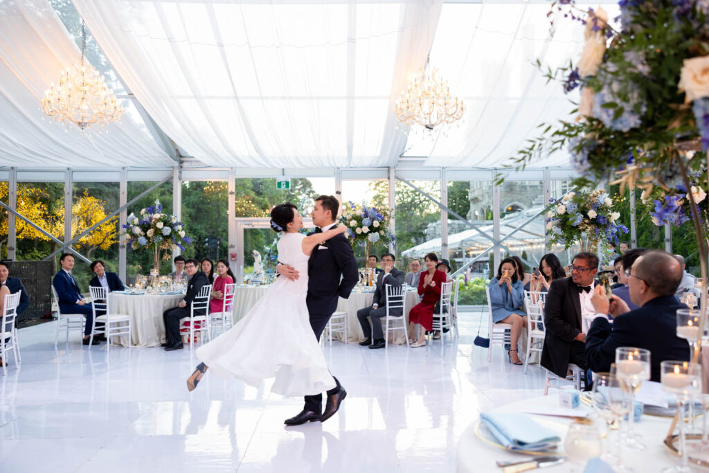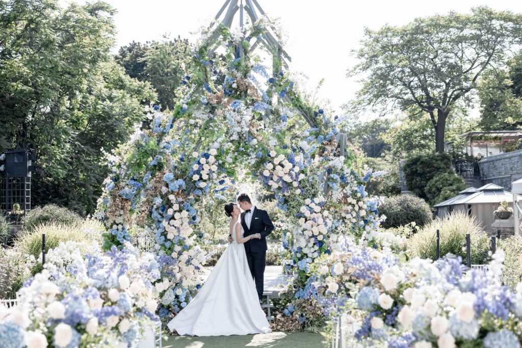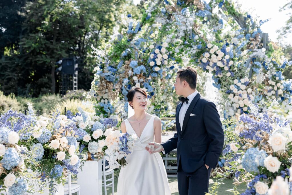 The wedding’s color palette was a dreamy combination of soft blues and purples, creating a romantic and elegant atmosphere. These colors were beautifully incorporated into the floral arrangements, table settings, and even the bridal party’s attire. The castle’s garden was transformed into a floral wonderland, with delicate blooms adding a touch of natural beauty to the historic venue. Casa Loma, with its grand architecture and lush gardens, was the perfect choice for Siyu and Alex’s wedding. The ceremony took place in the castle’s picturesque courtyard, surrounded by blooming flowers and the soft glow of natural light. As the sun set, the reception moved to a stunning transparent tent in the castle’s backyard, where the couple and their guests enjoyed an unforgettable evening under the stars. As night fell, the tent was illuminated by the warm glow of candlelight, creating a magical and intimate atmosphere. The reception was filled with heartfelt speeches from loved ones, each one bringing tears of joy and laughter. The combination of twinkling lights, soft music, and the castle’s historic charm made for a truly enchanting evening.