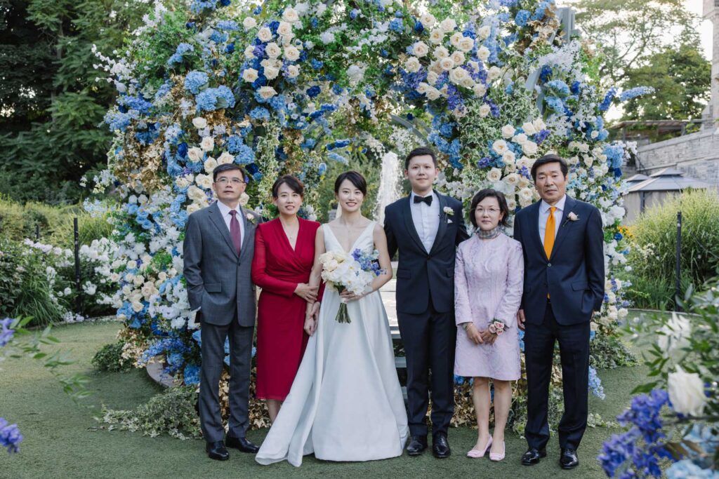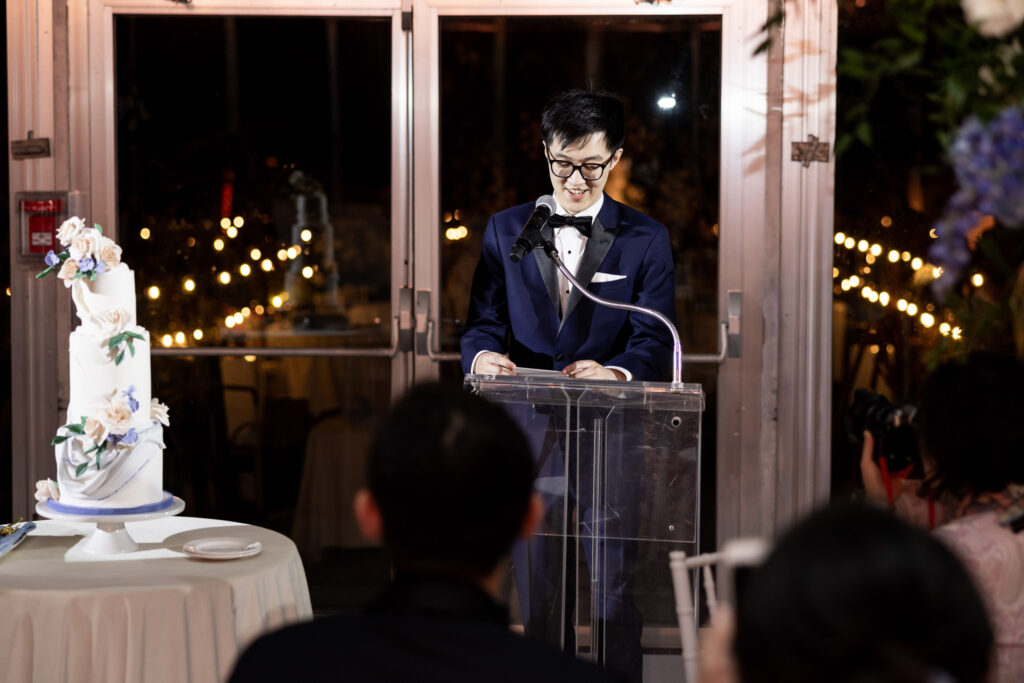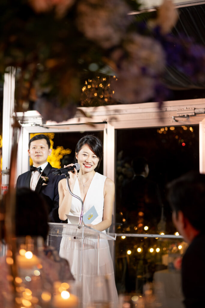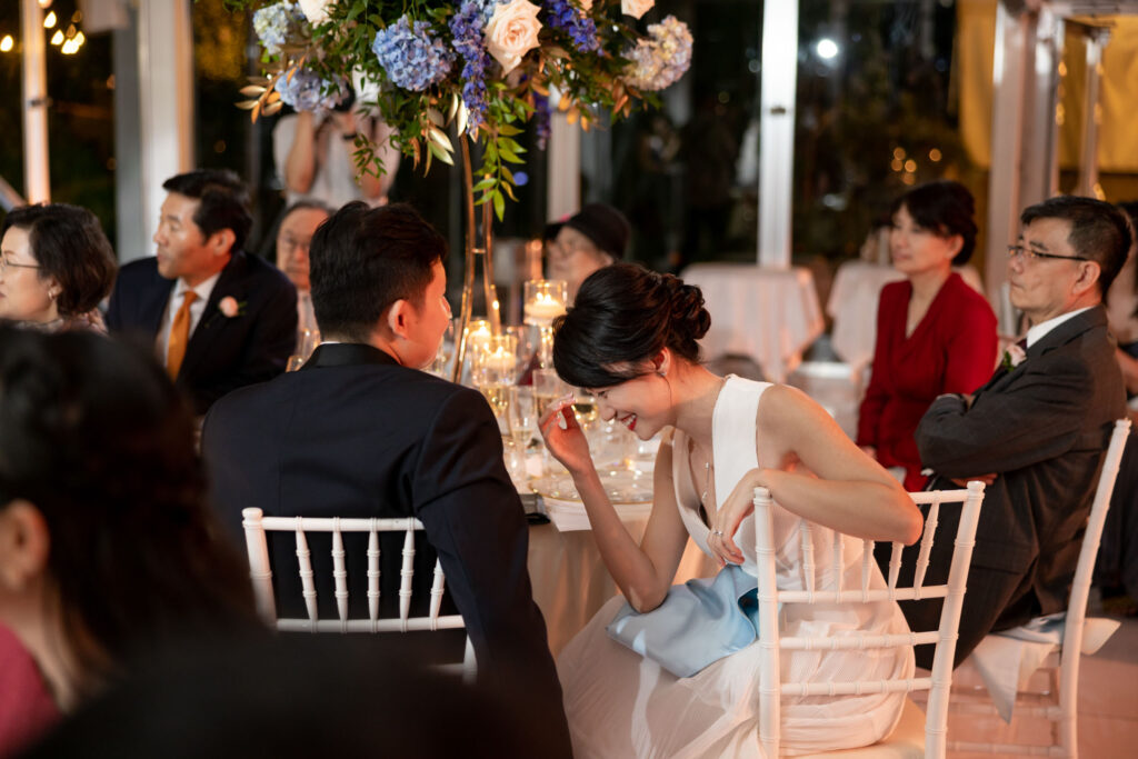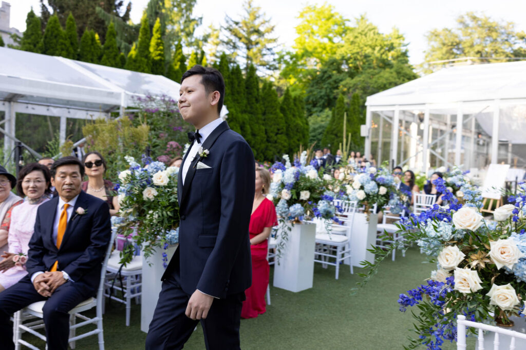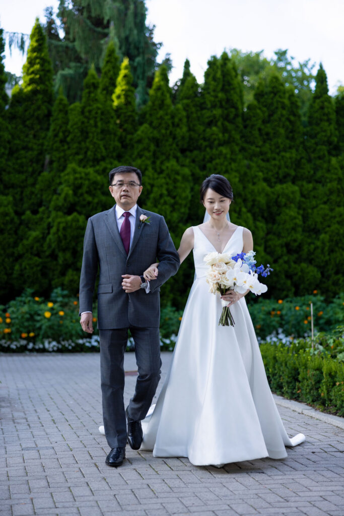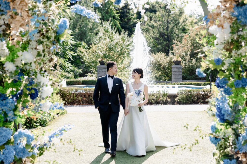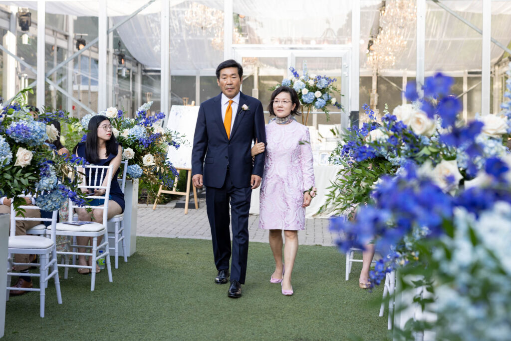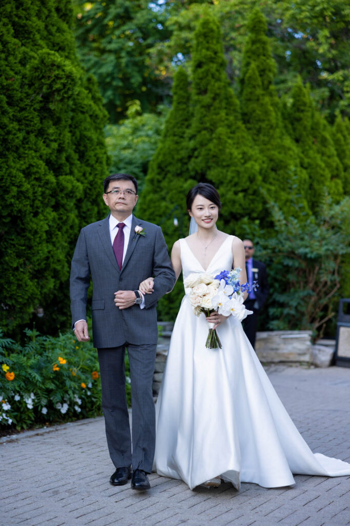 The wedding’s color palette was a dreamy combination of soft blues and purples, creating a romantic and elegant atmosphere. These colors were beautifully incorporated into the floral arrangements, table settings, and even the bridal party’s attire. The castle’s garden was transformed into a floral wonderland, with delicate blooms adding a touch of natural beauty to the historic venue. Casa Loma, with its grand architecture and lush gardens, was the perfect choice for Siyu and Alex’s wedding. The ceremony took place in the castle’s picturesque courtyard, surrounded by blooming flowers and the soft glow of natural light. As the sun set, the reception moved to a stunning transparent tent in the castle’s backyard, where the couple and their guests enjoyed an unforgettable evening under the stars. As night fell, the tent was illuminated by the warm glow of candlelight, creating a magical and intimate atmosphere. The reception was filled with heartfelt speeches from loved ones, each one bringing tears of joy and laughter. The combination of twinkling lights, soft music, and the castle’s historic charm made for a truly enchanting evening.