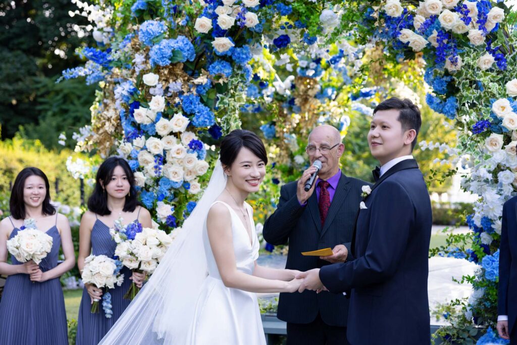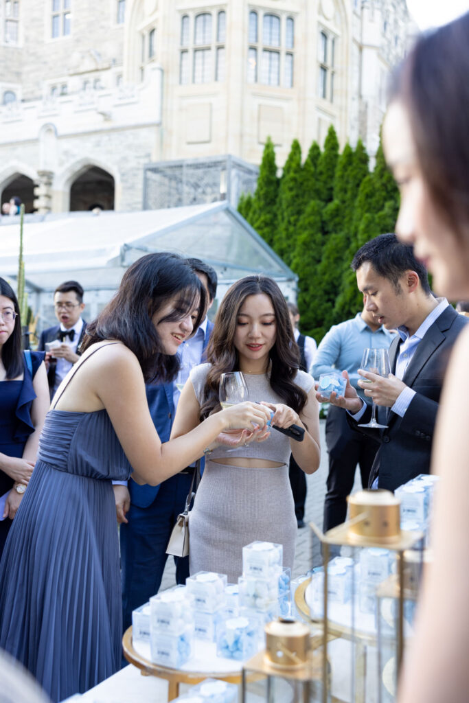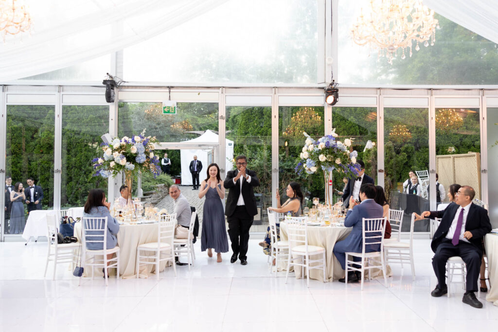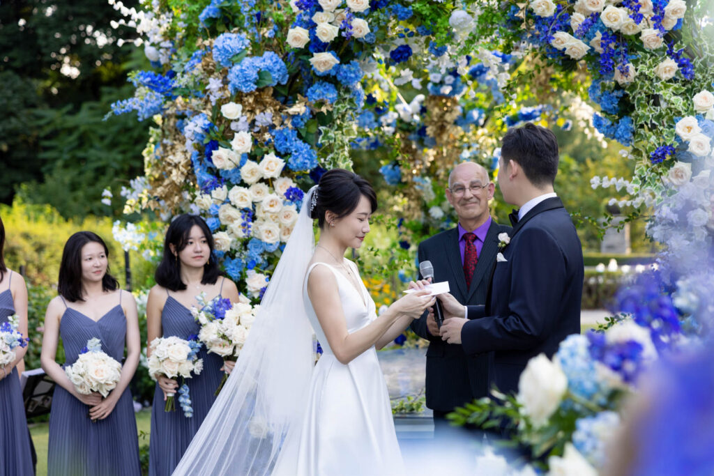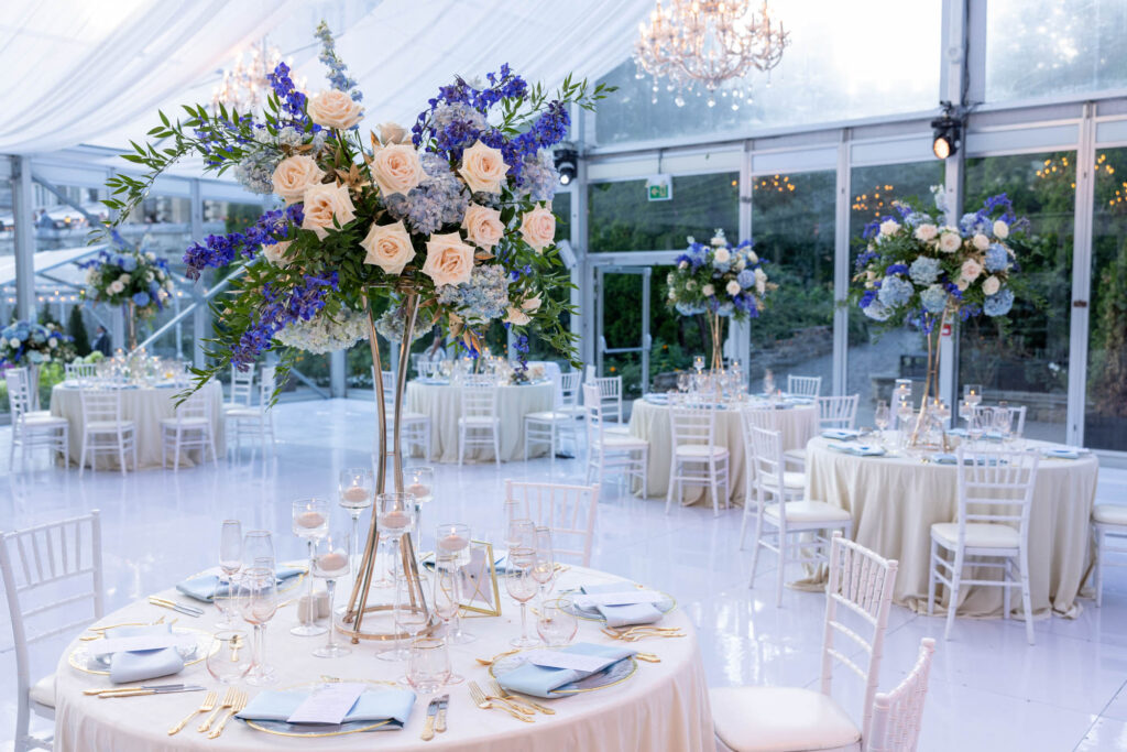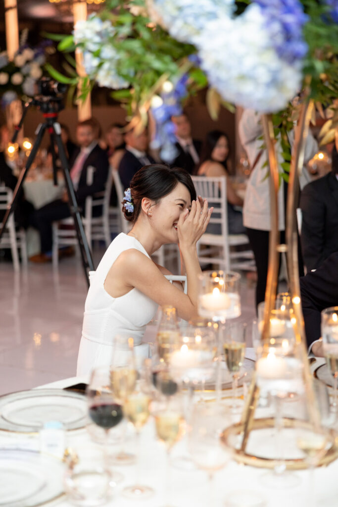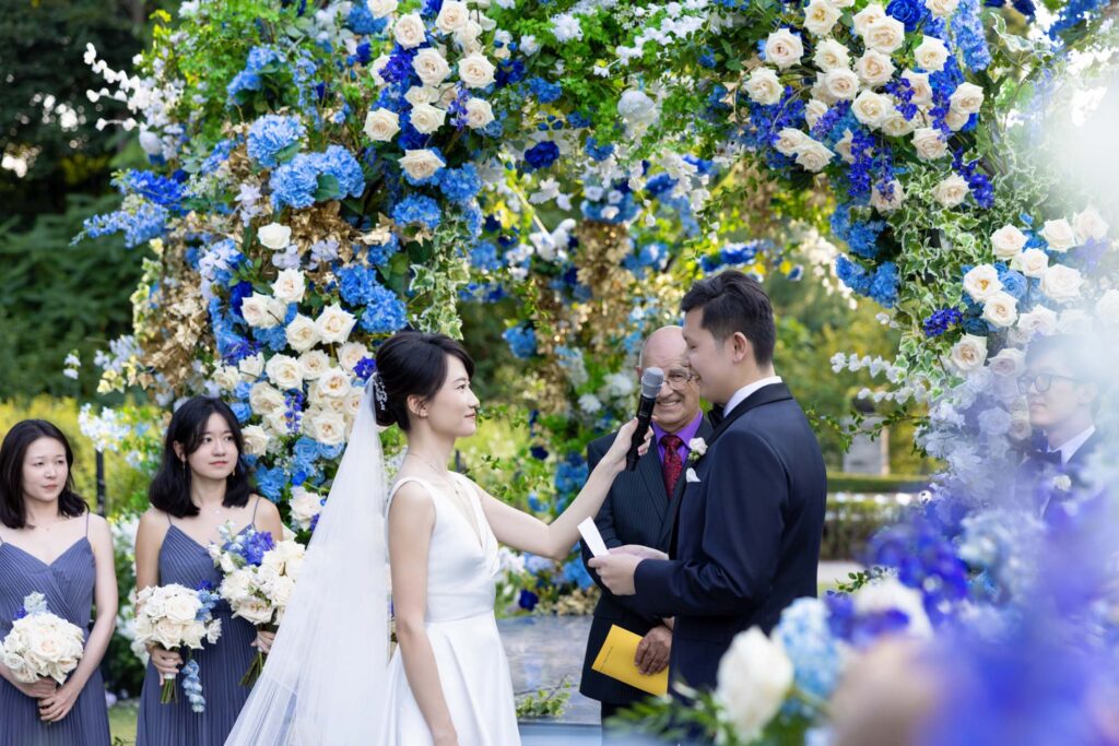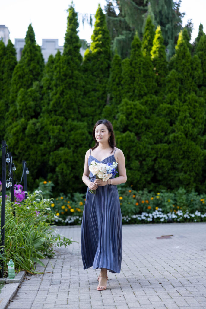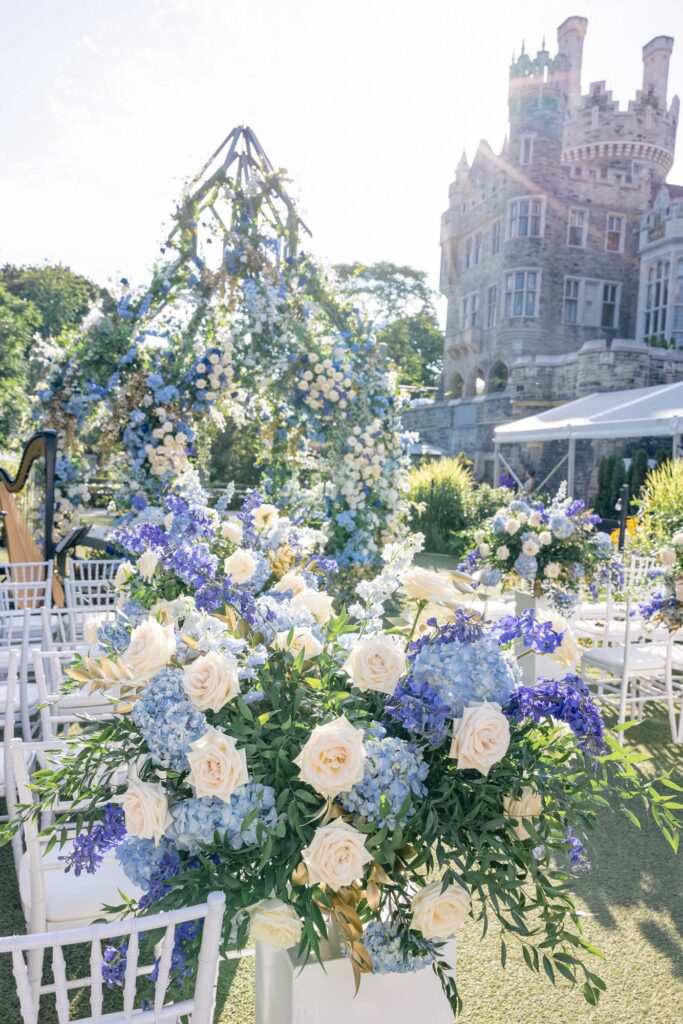 The wedding’s color palette was a dreamy combination of soft blues and purples, creating a romantic and elegant atmosphere. These colors were beautifully incorporated into the floral arrangements, table settings, and even the bridal party’s attire. The castle’s garden was transformed into a floral wonderland, with delicate blooms adding a touch of natural beauty to the historic venue. Casa Loma, with its grand architecture and lush gardens, was the perfect choice for Siyu and Alex’s wedding. The ceremony took place in the castle’s picturesque courtyard, surrounded by blooming flowers and the soft glow of natural light. As the sun set, the reception moved to a stunning transparent tent in the castle’s backyard, where the couple and their guests enjoyed an unforgettable evening under the stars. As night fell, the tent was illuminated by the warm glow of candlelight, creating a magical and intimate atmosphere. The reception was filled with heartfelt speeches from loved ones, each one bringing tears of joy and laughter. The combination of twinkling lights, soft music, and the castle’s historic charm made for a truly enchanting evening.
