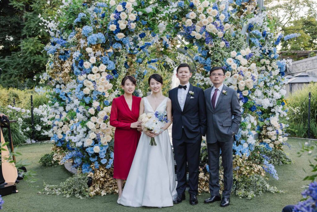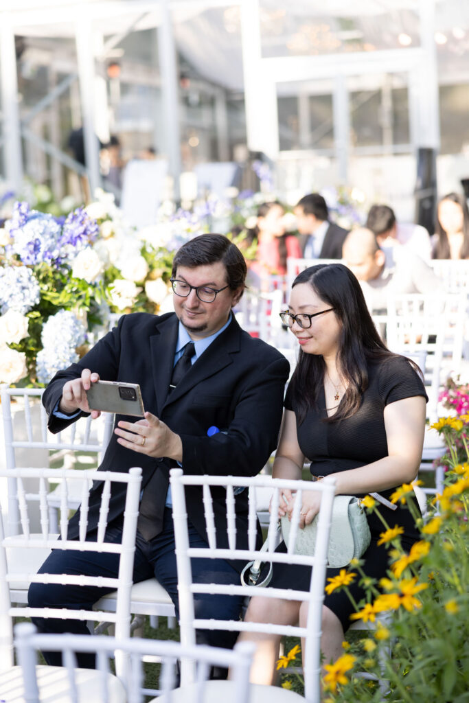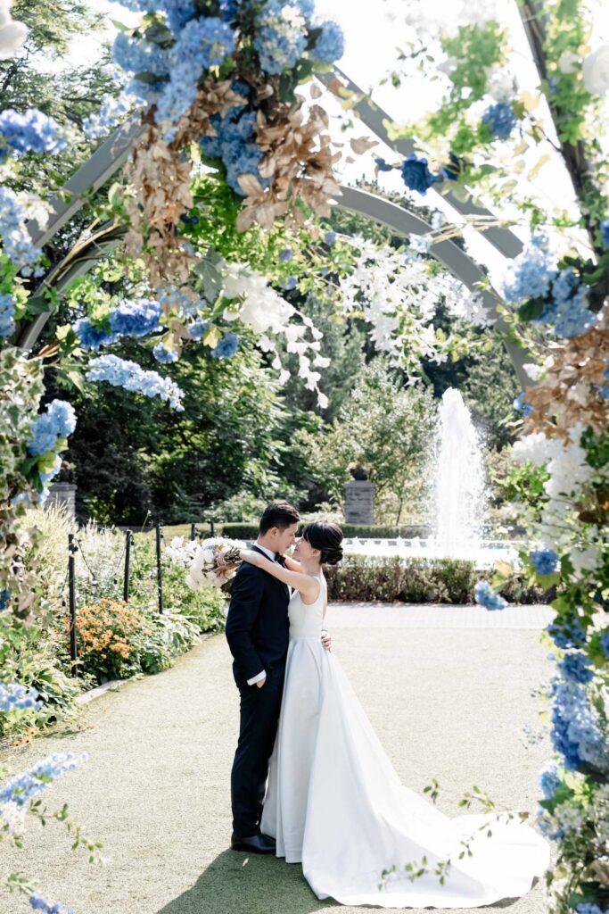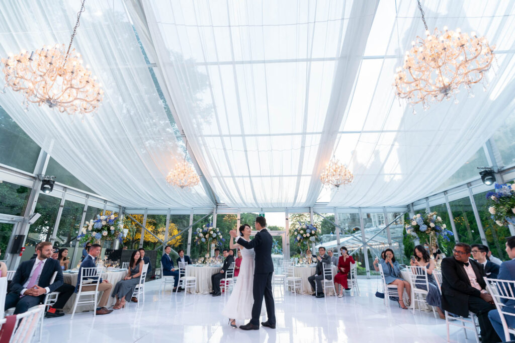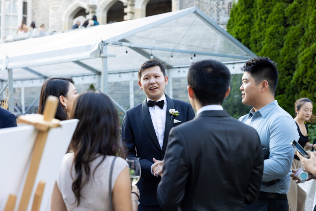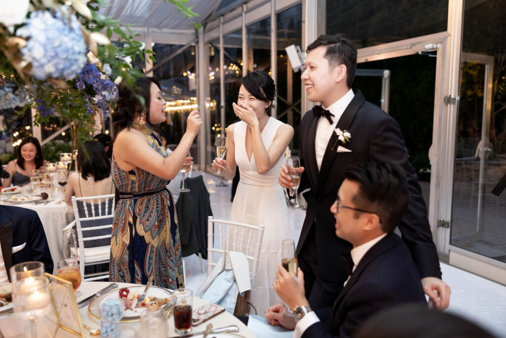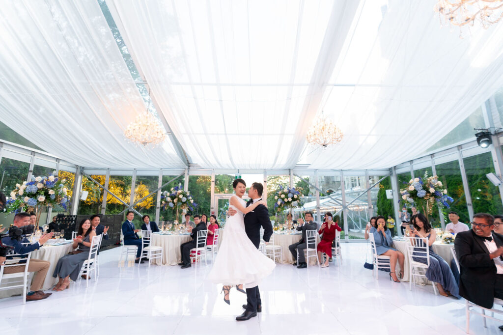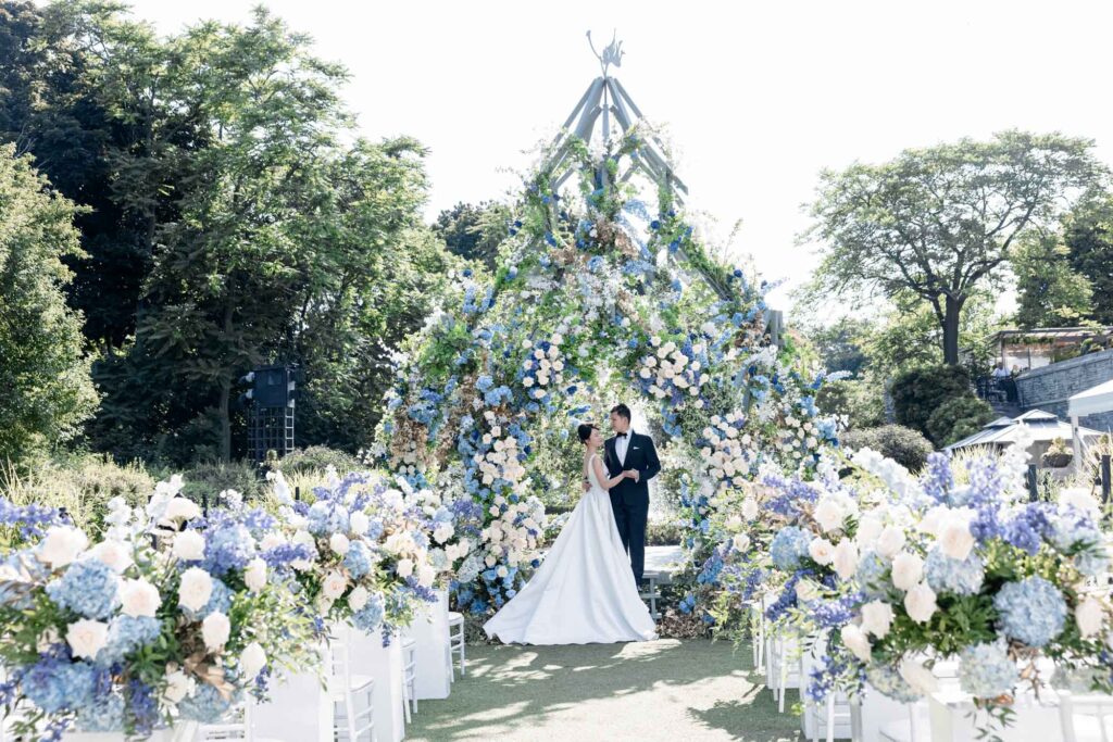 The wedding’s color palette was a dreamy combination of soft blues and purples, creating a romantic and elegant atmosphere. These colors were beautifully incorporated into the floral arrangements, table settings, and even the bridal party’s attire. The castle’s garden was transformed into a floral wonderland, with delicate blooms adding a touch of natural beauty to the historic venue. Casa Loma, with its grand architecture and lush gardens, was the perfect choice for Siyu and Alex’s wedding. The ceremony took place in the castle’s picturesque courtyard, surrounded by blooming flowers and the soft glow of natural light. As the sun set, the reception moved to a stunning transparent tent in the castle’s backyard, where the couple and their guests enjoyed an unforgettable evening under the stars. As night fell, the tent was illuminated by the warm glow of candlelight, creating a magical and intimate atmosphere. The reception was filled with heartfelt speeches from loved ones, each one bringing tears of joy and laughter. The combination of twinkling lights, soft music, and the castle’s historic charm made for a truly enchanting evening.
