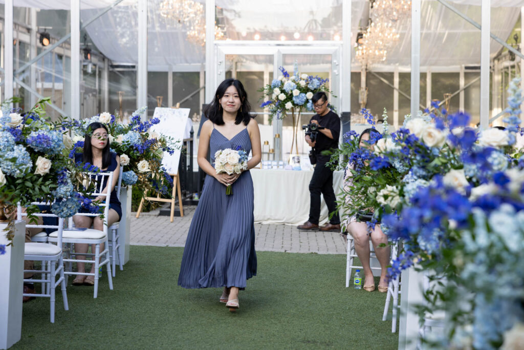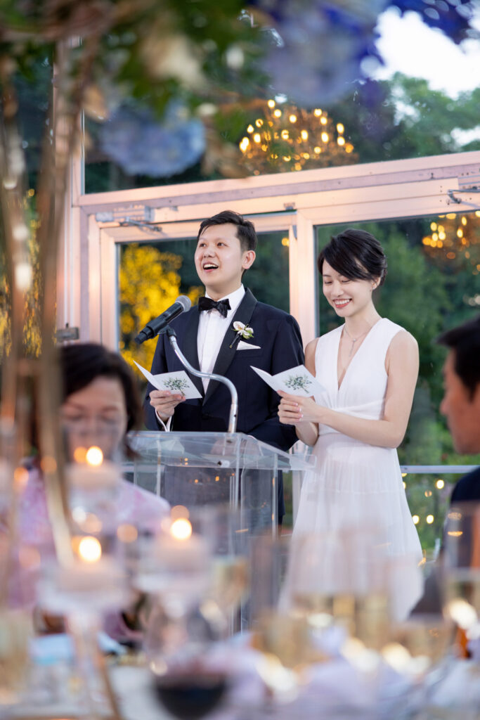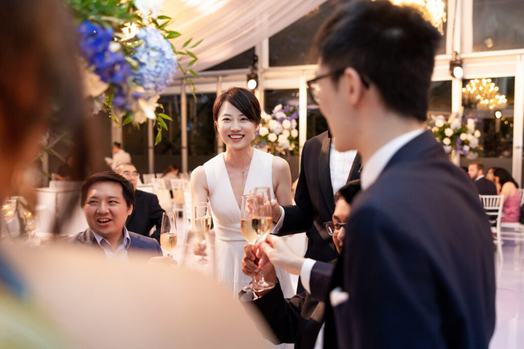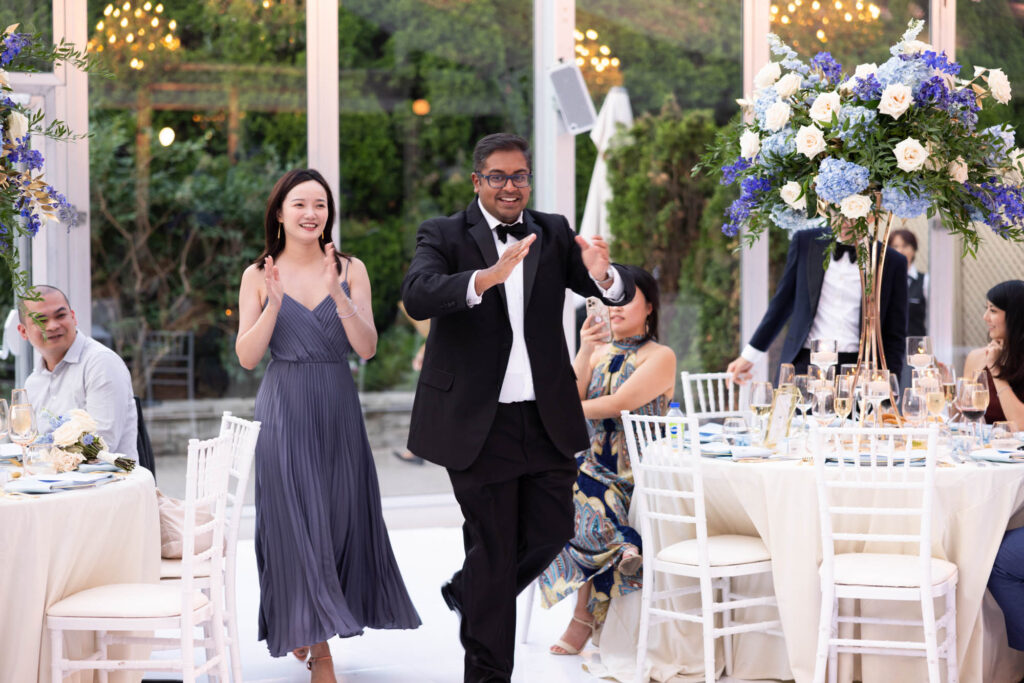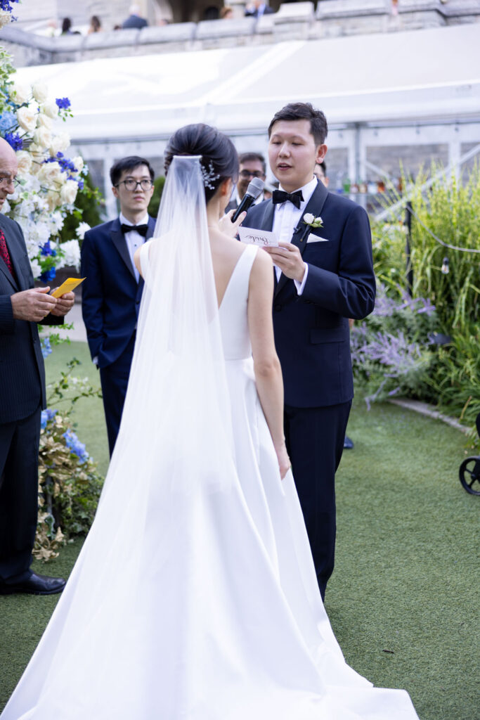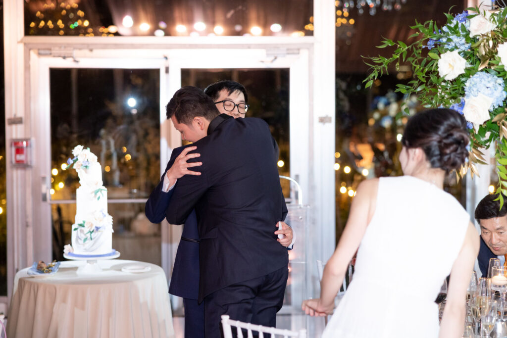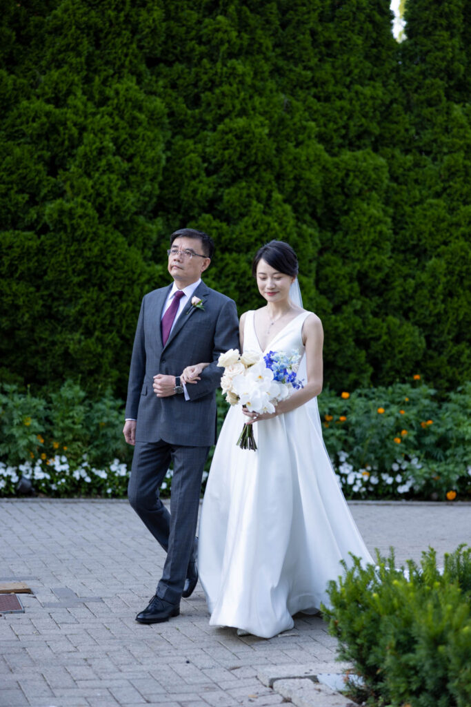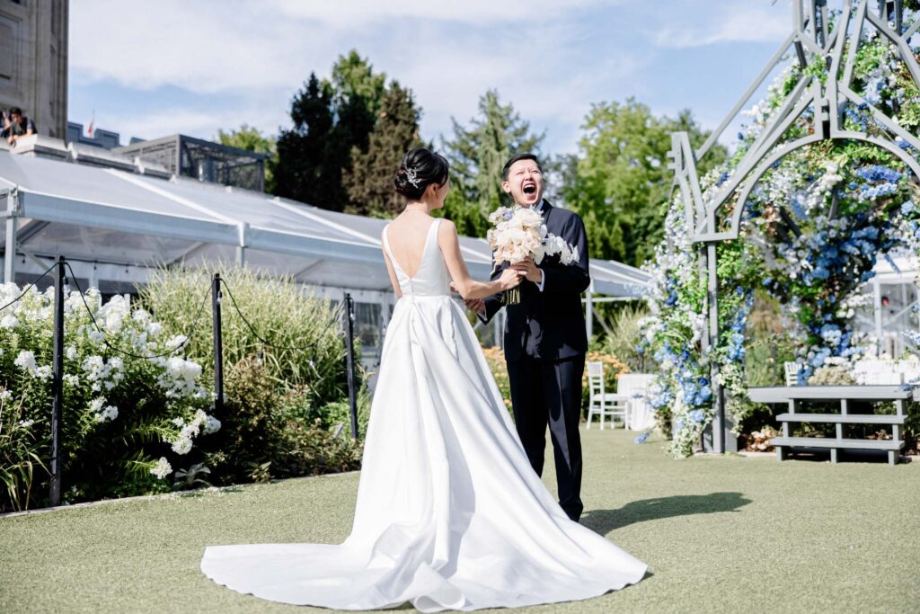 The wedding’s color palette was a dreamy combination of soft blues and purples, creating a romantic and elegant atmosphere. These colors were beautifully incorporated into the floral arrangements, table settings, and even the bridal party’s attire. The castle’s garden was transformed into a floral wonderland, with delicate blooms adding a touch of natural beauty to the historic venue. Casa Loma, with its grand architecture and lush gardens, was the perfect choice for Siyu and Alex’s wedding. The ceremony took place in the castle’s picturesque courtyard, surrounded by blooming flowers and the soft glow of natural light. As the sun set, the reception moved to a stunning transparent tent in the castle’s backyard, where the couple and their guests enjoyed an unforgettable evening under the stars. As night fell, the tent was illuminated by the warm glow of candlelight, creating a magical and intimate atmosphere. The reception was filled with heartfelt speeches from loved ones, each one bringing tears of joy and laughter. The combination of twinkling lights, soft music, and the castle’s historic charm made for a truly enchanting evening.