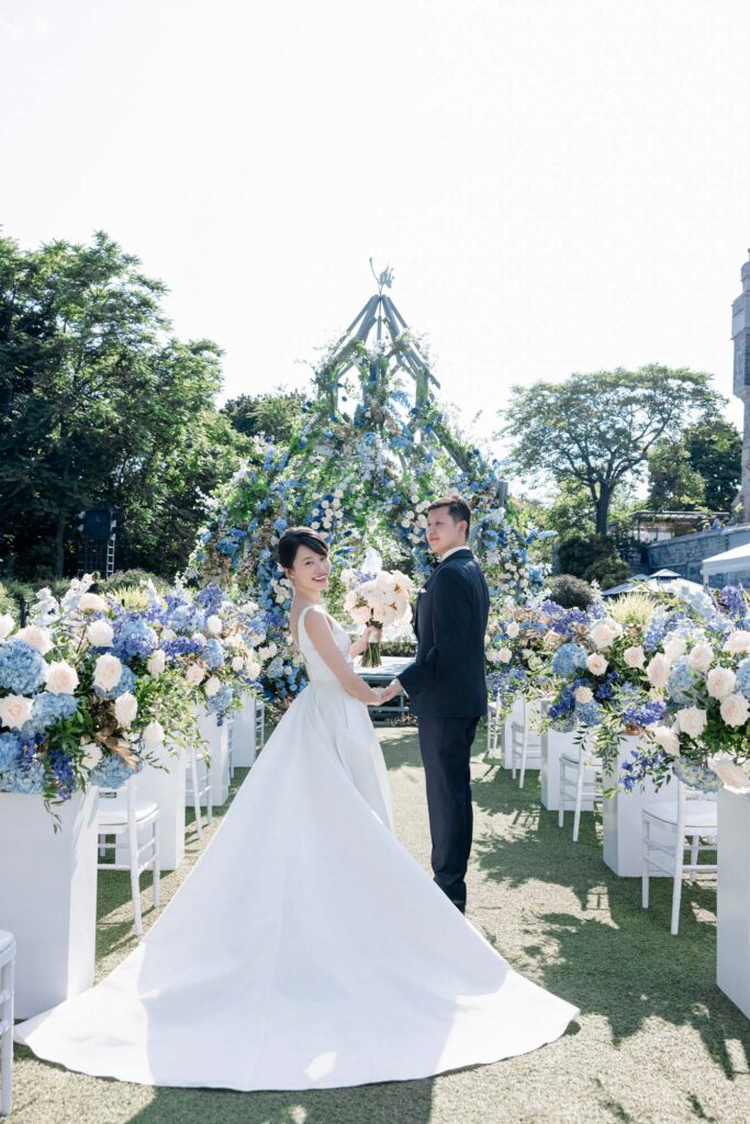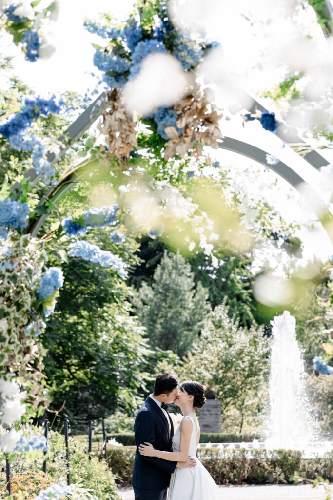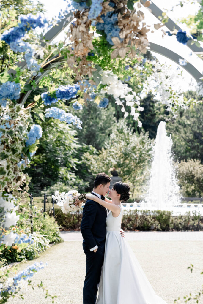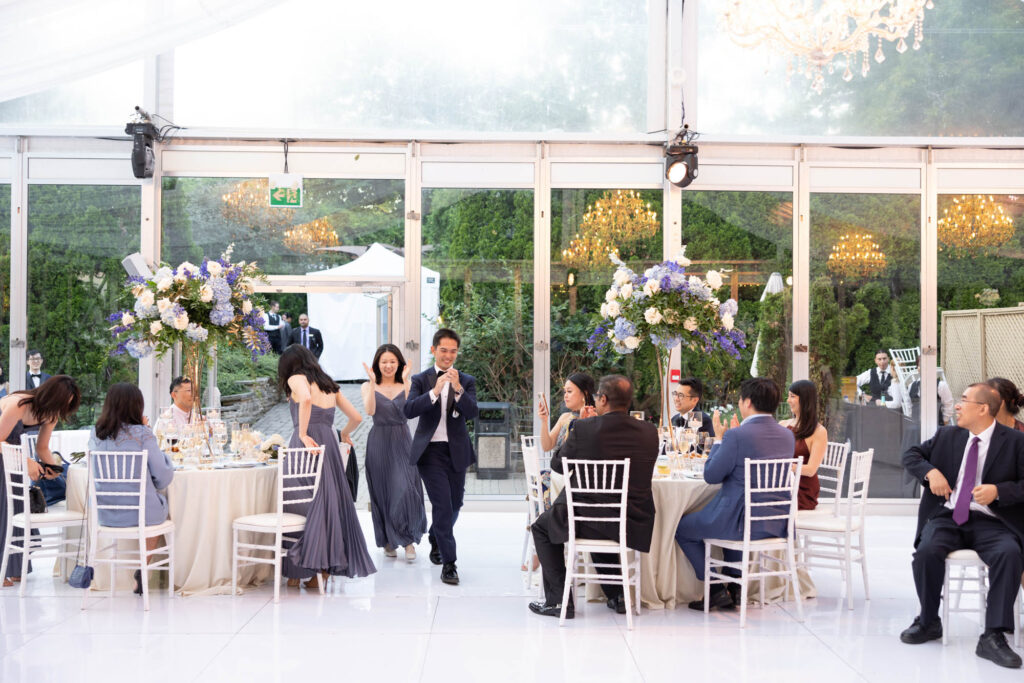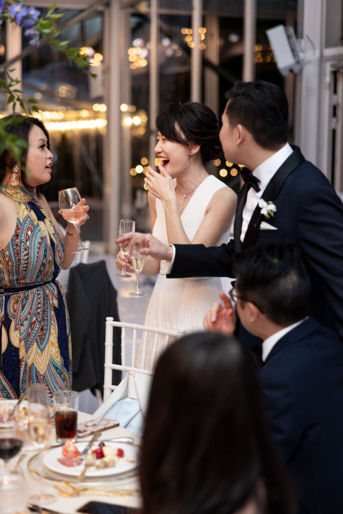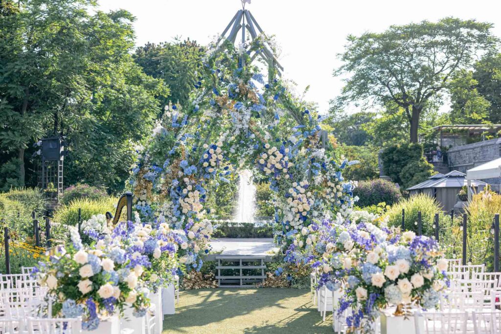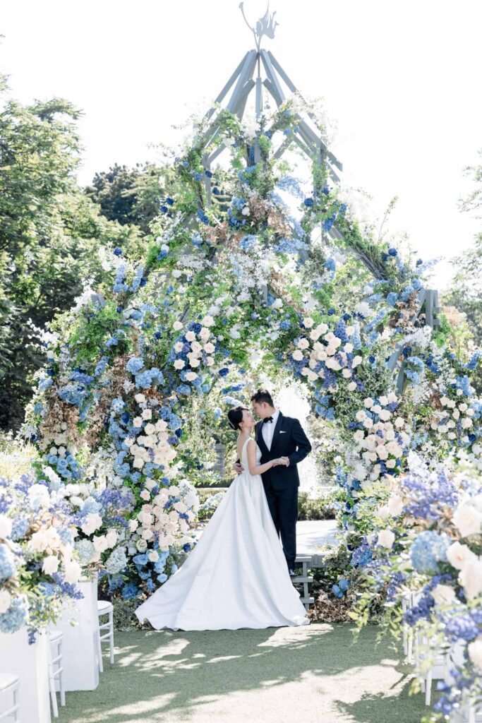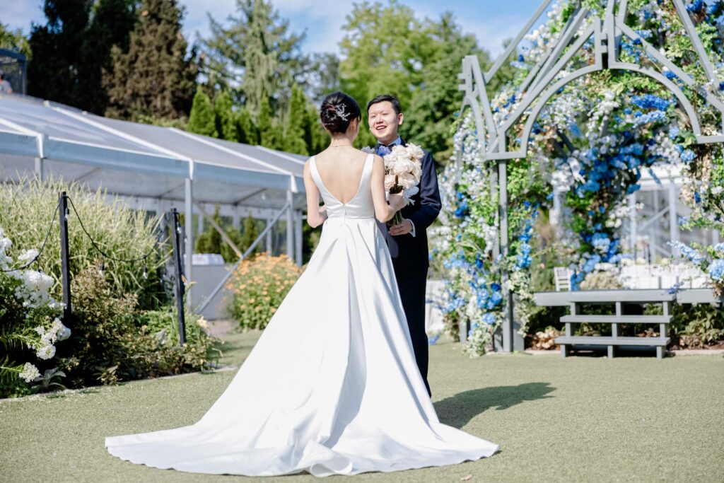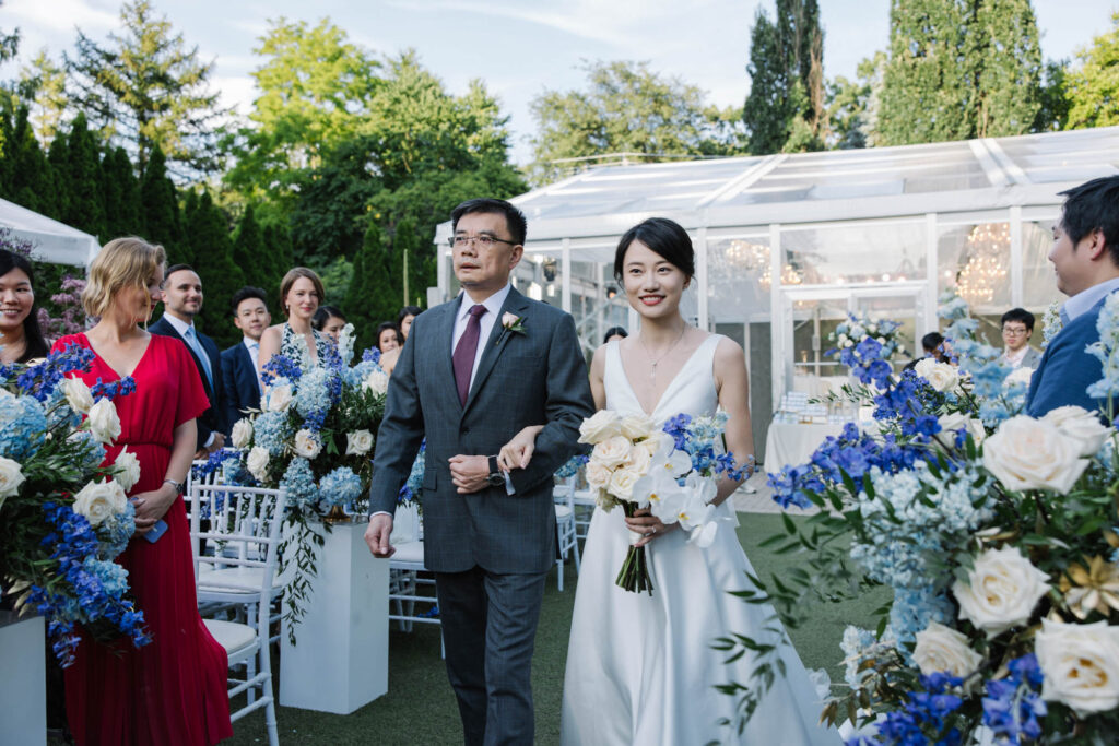 The wedding’s color palette was a dreamy combination of soft blues and purples, creating a romantic and elegant atmosphere. These colors were beautifully incorporated into the floral arrangements, table settings, and even the bridal party’s attire. The castle’s garden was transformed into a floral wonderland, with delicate blooms adding a touch of natural beauty to the historic venue. Casa Loma, with its grand architecture and lush gardens, was the perfect choice for Siyu and Alex’s wedding. The ceremony took place in the castle’s picturesque courtyard, surrounded by blooming flowers and the soft glow of natural light. As the sun set, the reception moved to a stunning transparent tent in the castle’s backyard, where the couple and their guests enjoyed an unforgettable evening under the stars. As night fell, the tent was illuminated by the warm glow of candlelight, creating a magical and intimate atmosphere. The reception was filled with heartfelt speeches from loved ones, each one bringing tears of joy and laughter. The combination of twinkling lights, soft music, and the castle’s historic charm made for a truly enchanting evening.