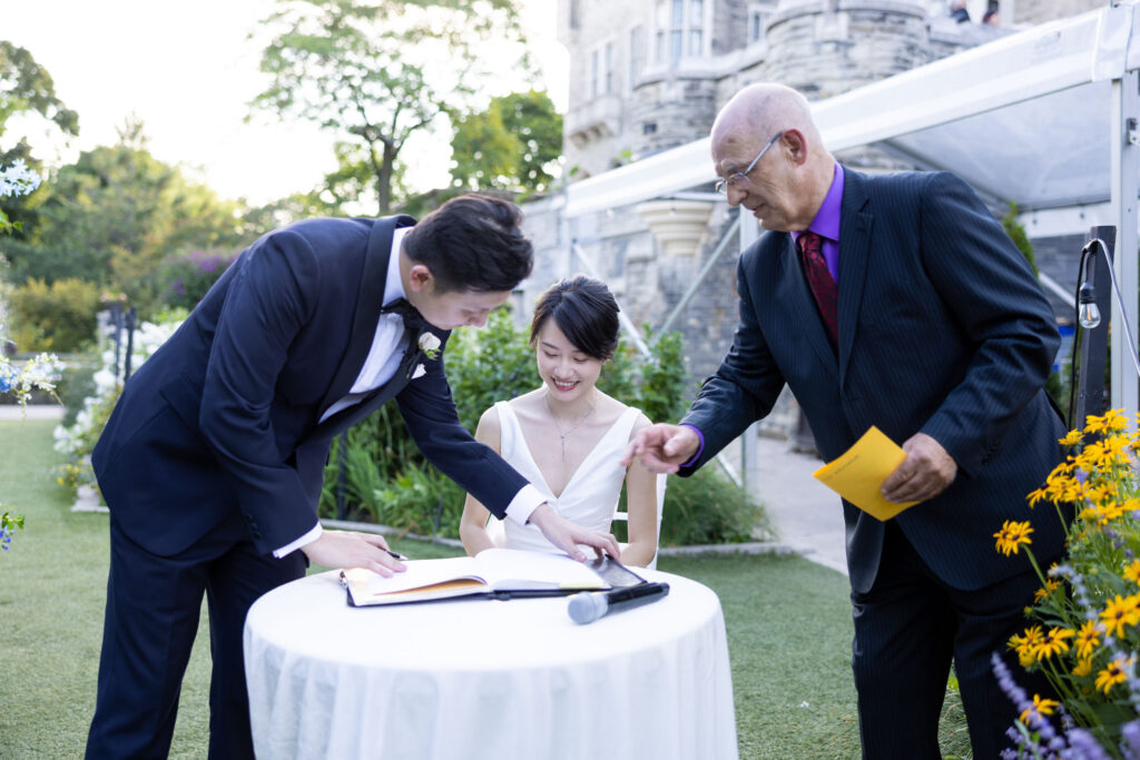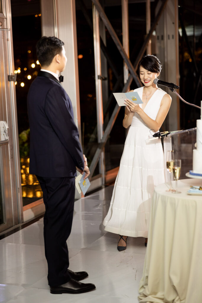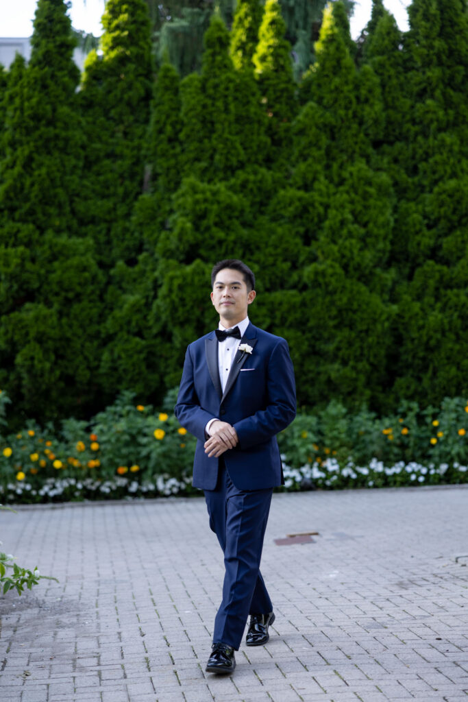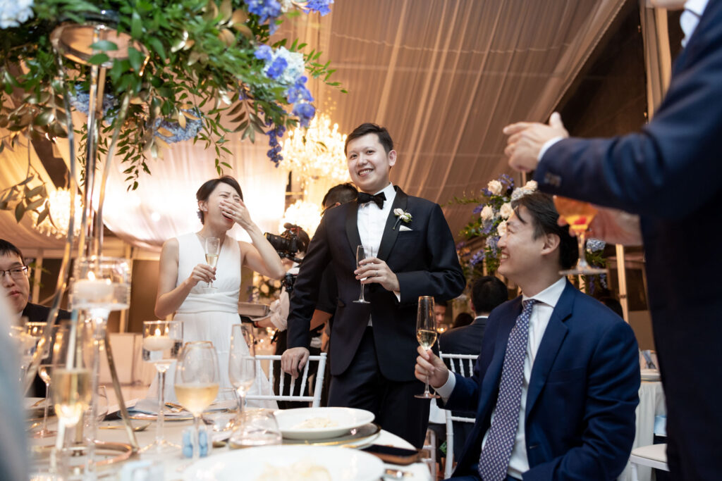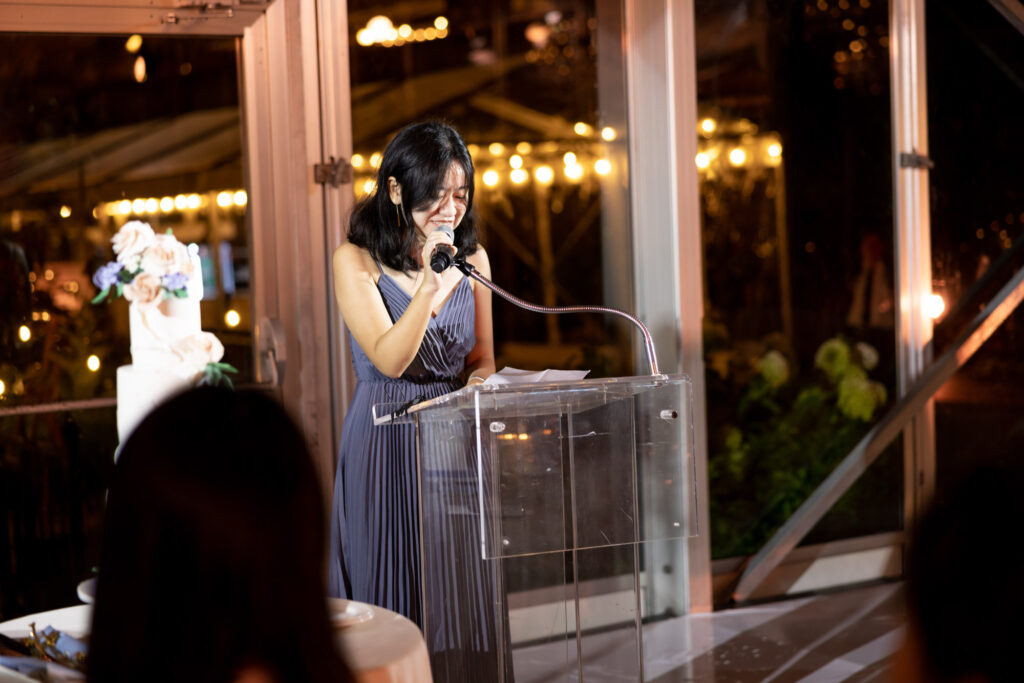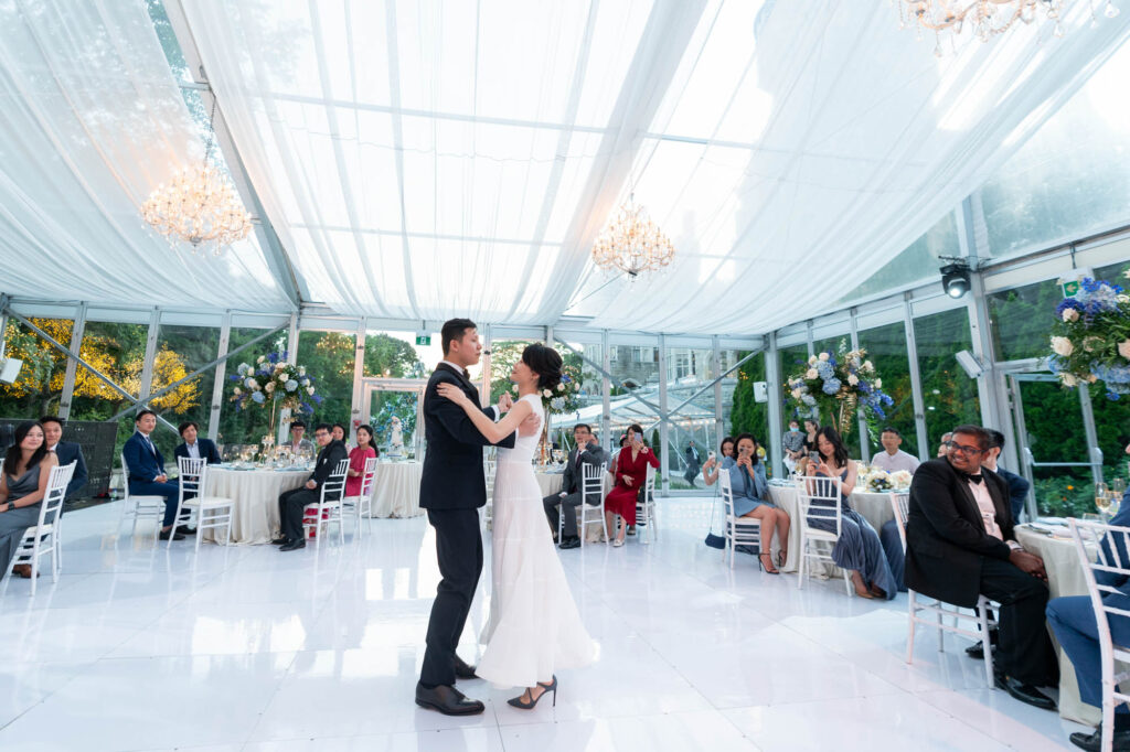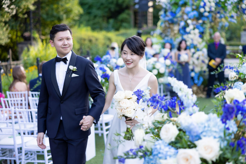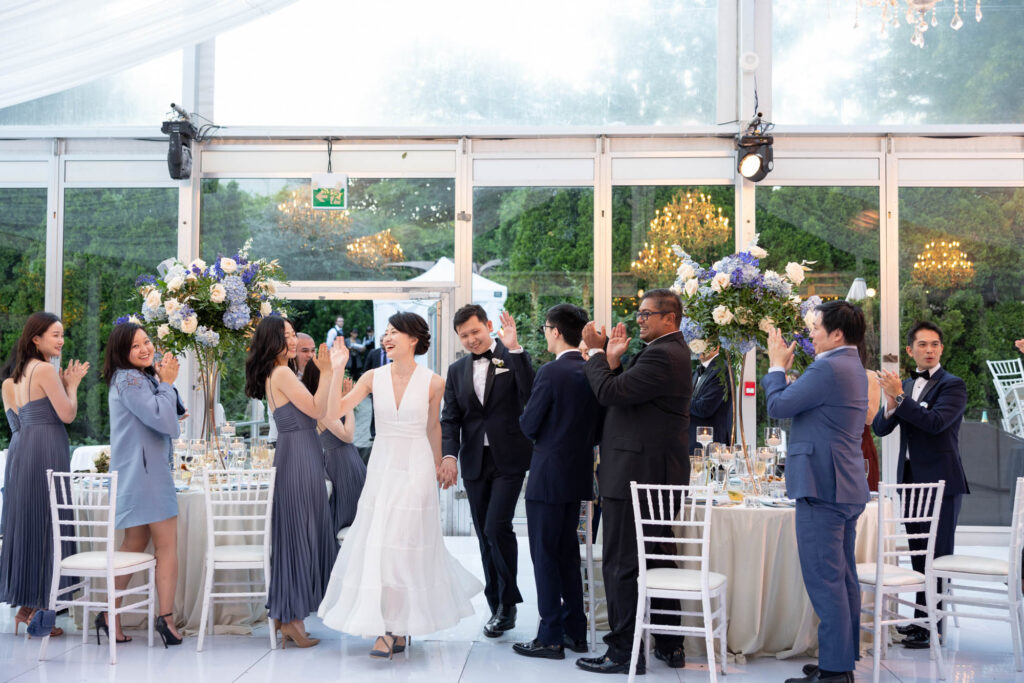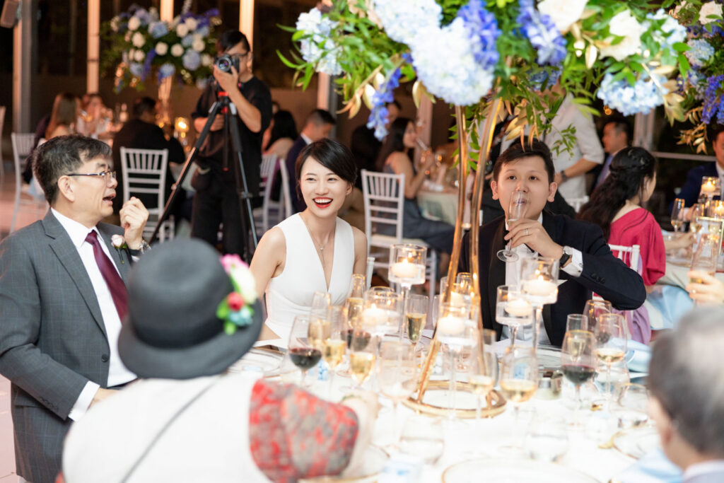 The wedding’s color palette was a dreamy combination of soft blues and purples, creating a romantic and elegant atmosphere. These colors were beautifully incorporated into the floral arrangements, table settings, and even the bridal party’s attire. The castle’s garden was transformed into a floral wonderland, with delicate blooms adding a touch of natural beauty to the historic venue. Casa Loma, with its grand architecture and lush gardens, was the perfect choice for Siyu and Alex’s wedding. The ceremony took place in the castle’s picturesque courtyard, surrounded by blooming flowers and the soft glow of natural light. As the sun set, the reception moved to a stunning transparent tent in the castle’s backyard, where the couple and their guests enjoyed an unforgettable evening under the stars. As night fell, the tent was illuminated by the warm glow of candlelight, creating a magical and intimate atmosphere. The reception was filled with heartfelt speeches from loved ones, each one bringing tears of joy and laughter. The combination of twinkling lights, soft music, and the castle’s historic charm made for a truly enchanting evening.